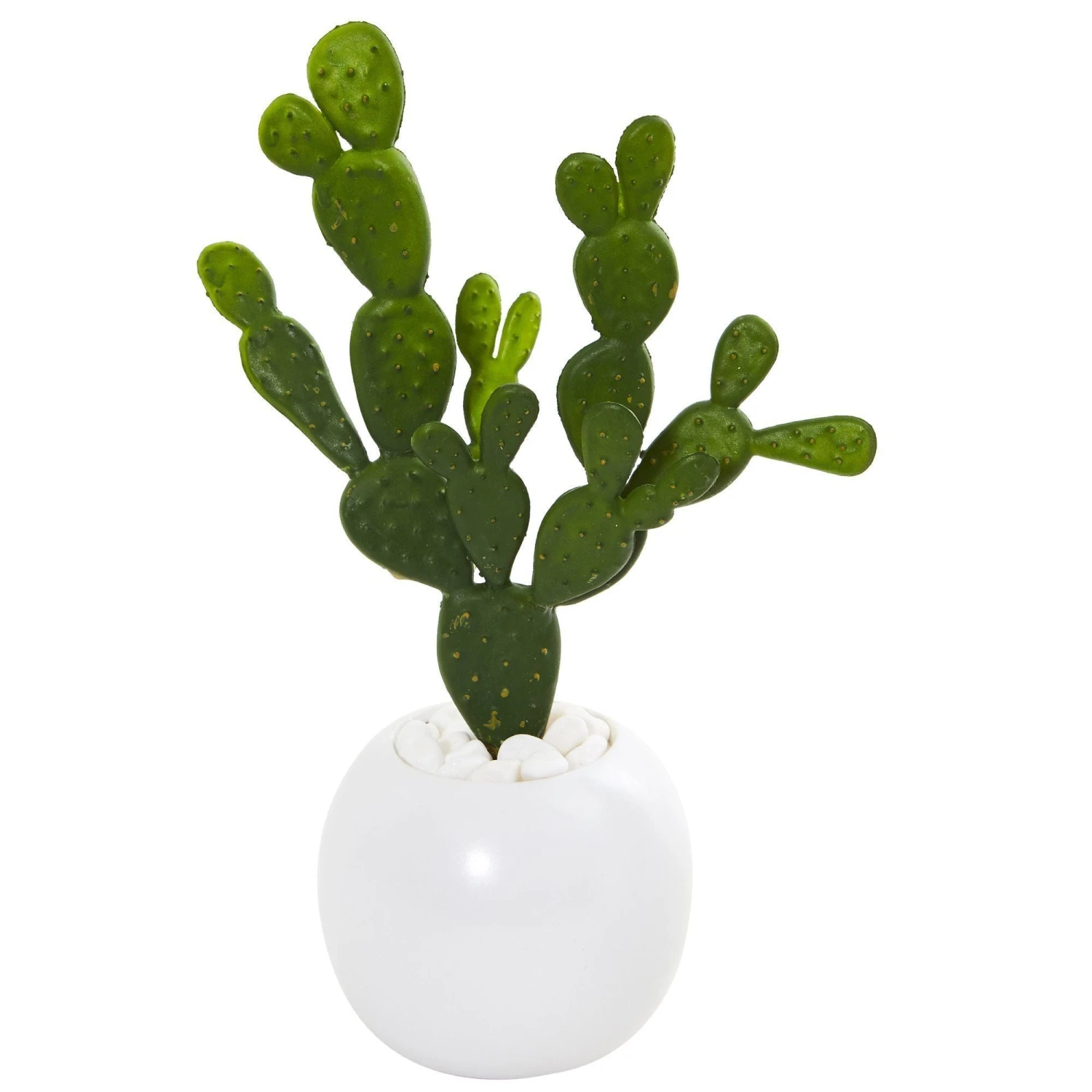 Add southwest flair to your decor with this set of three artificial cactus succulents. Boasting natural looking qualities of those in the natural world, each reaches 10” tall and are housed in individual white planters nestled with white rocks. Great for sprucing up an otherwise bare coffee table.