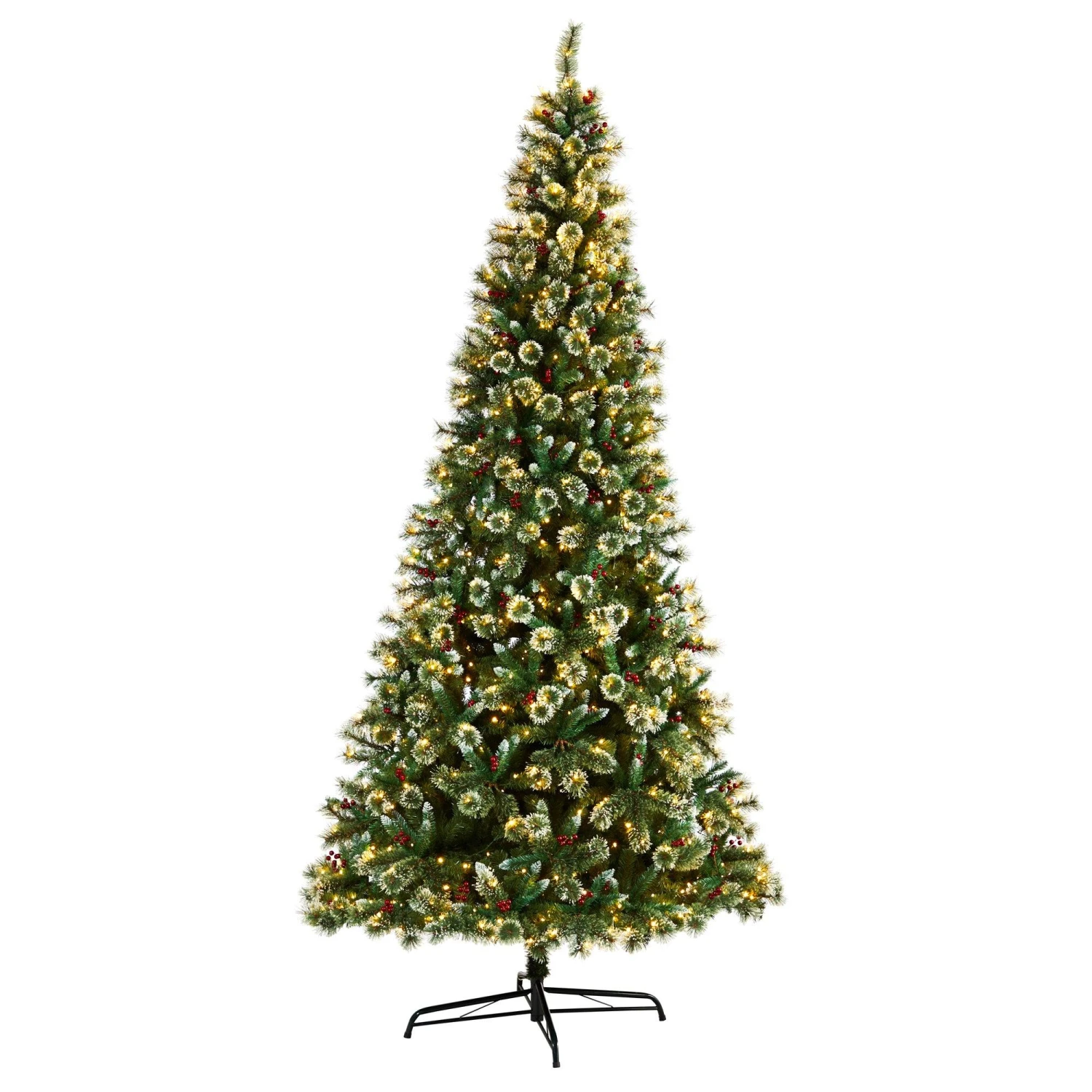 Have a berry merry Christmas with the help of this frosted Swiss Pine Artificial Christmas Tree. Inspired by nature, this robust silhouette mimics the real natural foliage and texture found in their counterparts with snow in the easy-to-bend branches. Arriving pre-strung with 850 clear LED lights for a warm, candle-like glow – this artificial Christmas tree also comes dressed from top to bottom with faux berries. Standing 10′ from a metal stand (included in height) this tree requires zero maintenance. All that’s missing are your decorations. Perfect for spaces that need some holiday cheer.