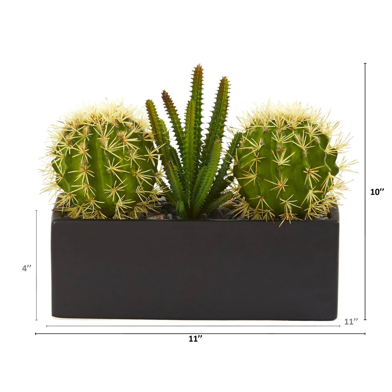 Spruce up a home or office environment with this artificial plant boasting a mix of realistic looking fake cacti, each intricately designed with naturally occurring qualities and carefully arranged in complementary hues. Resting 11” wide on a black planter accented with natural tone rocks, this fake plant is perfect for year-round display.