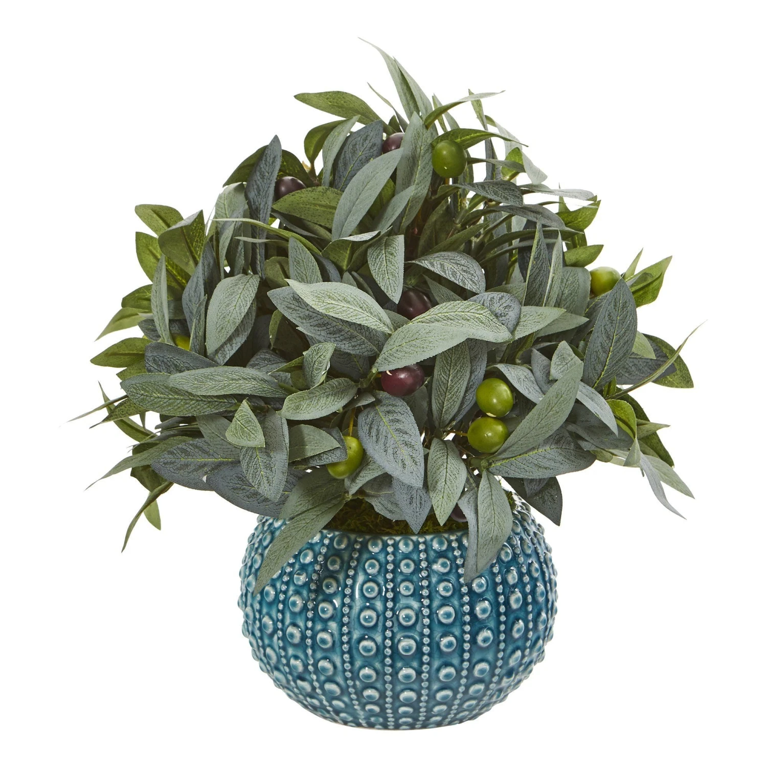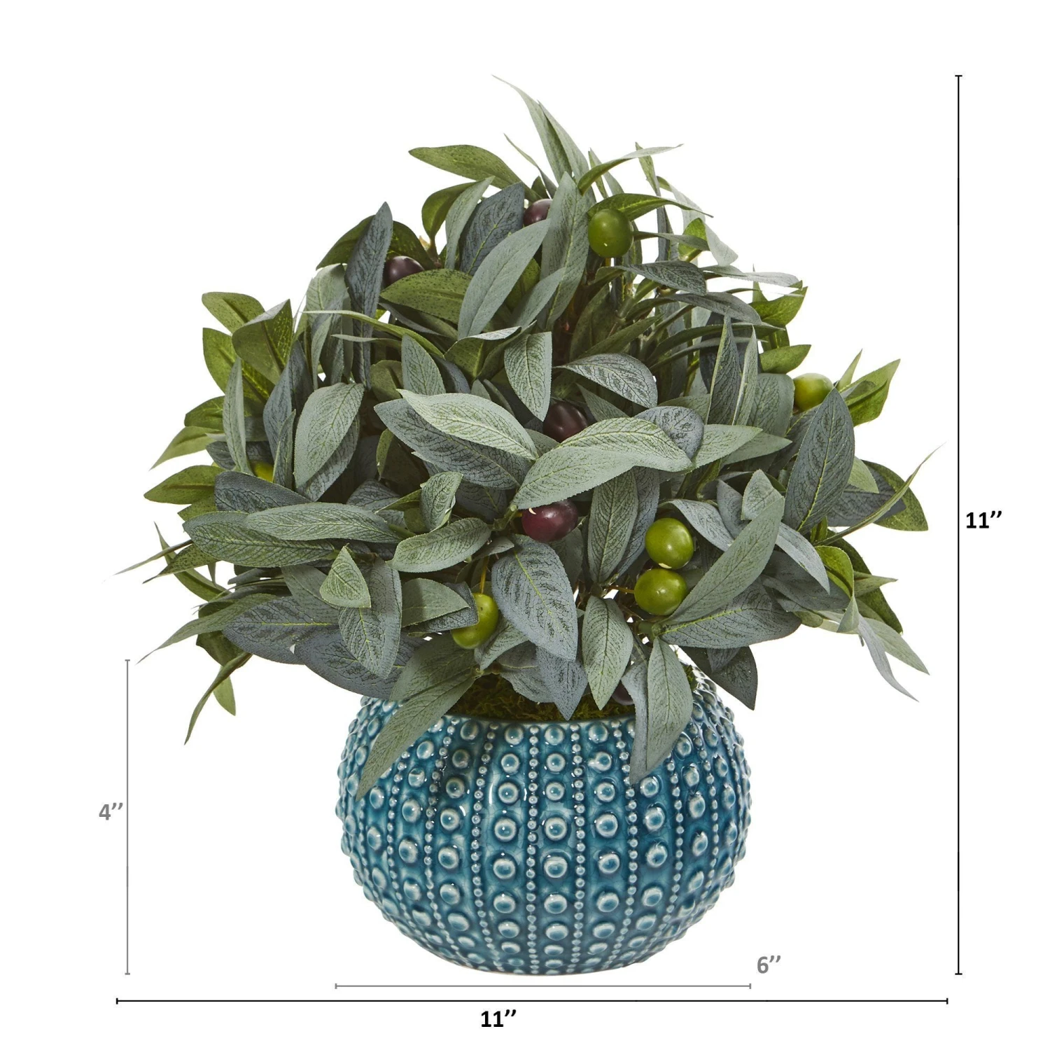 Welcome country beauty indoors with this artificial olive plant showcasing a cluster of lifelike foliage in soft subtle hues, accented throughout with realistic looking olive berries. Standing 11” high from a blue planter, this silk plant requires no daily upkeep or maintenance.