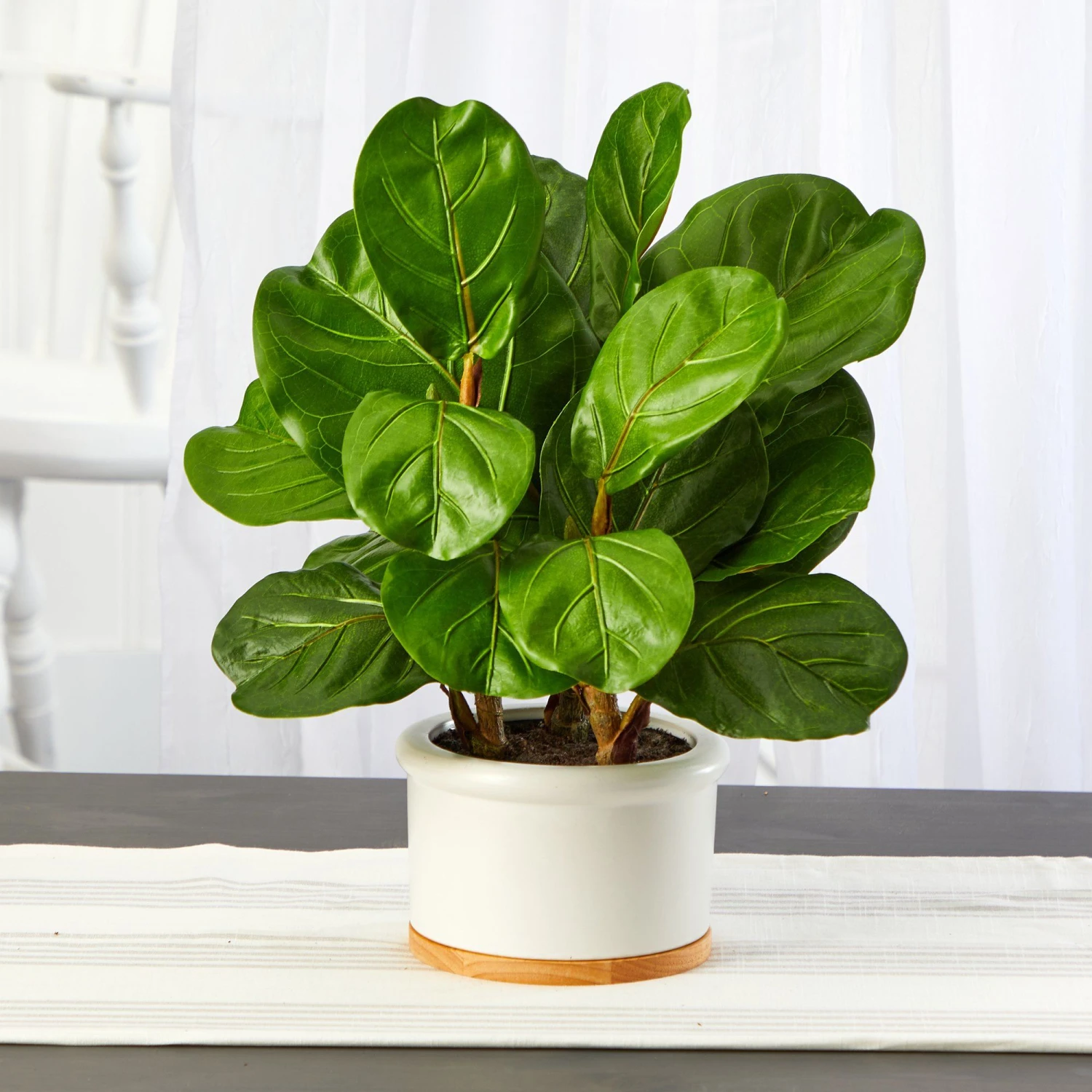 Create a natural sense of greenery in your home or office this vibrant artificial tree designed with oversized fiddle leaf fig leaves in glossy, verdant hues that look incredibly lifelike. A year-round (faux) favorite amongst interior decorators, this artificial fiddle leaf fig tree stands 15” high from a white ceramic planter and would easily provide year-round freshness to any space it inhabits.