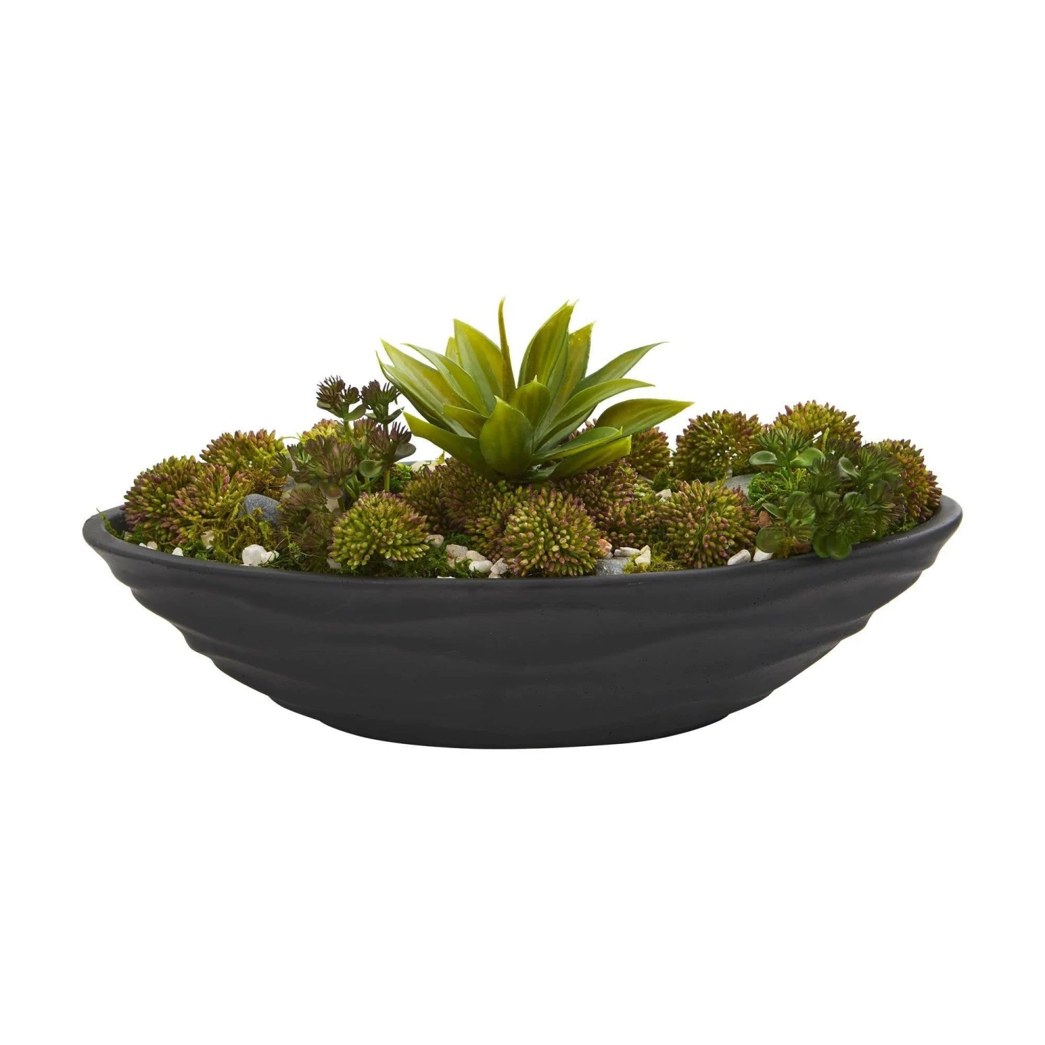 Achieve an effortless botanical vibe in your home or office with this arrangement of artificial agave and succulent garden plants. The simple beauty of the spiky green agave dominates the center of the arrangement while the different varieties of green succulents fill up the rest of the space in the oval black planter. Try placing this piece in the center of your dining room table or on the coffee table in your living room and match it with antique candle holder.