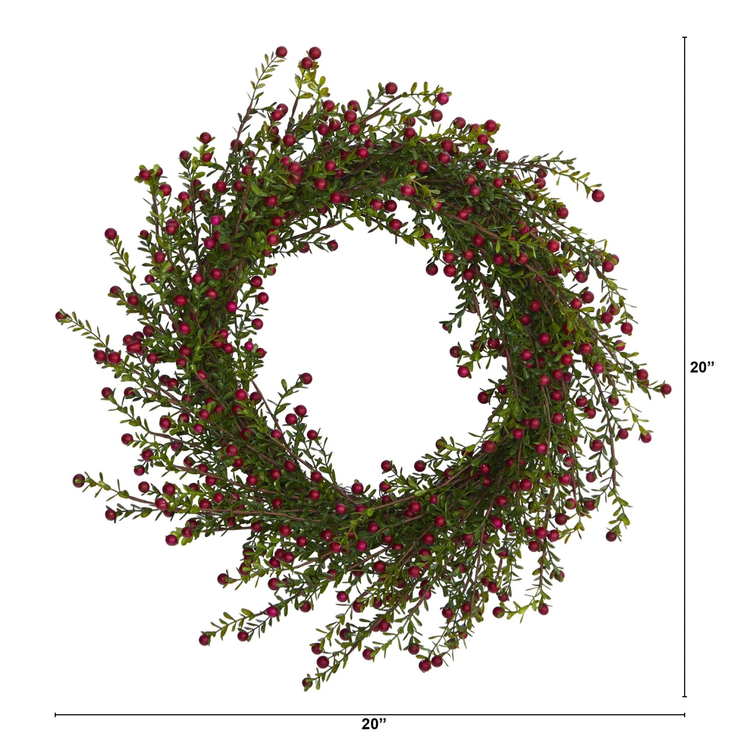 Ring out the seasonal cheer all throughout the winter holidays with the help of this artificial wreath. Intricately designed from realistic looking boxwood greenery, this decorative wreath comes carefully accented throughout with faux holly berries that look incredibly lifelike. Perfect for wall and/or door display in either a home or office environment, this cheerful 20” (in circumference) decorative wreath makes for an inviting accent and can undoubtedly help inject front-door appeal all throughout the season.