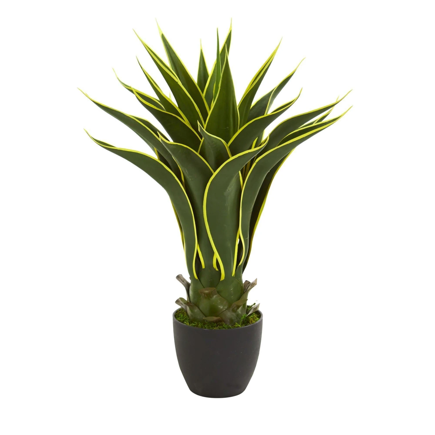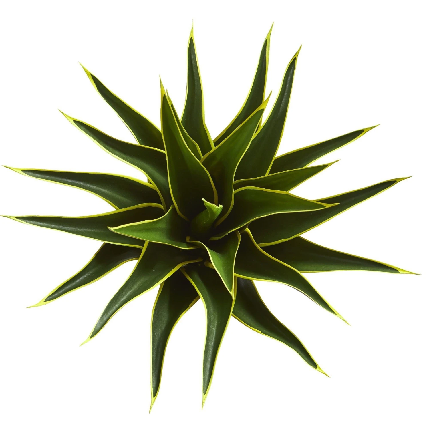 Variegated green leaves grow up and out of a single base on this artificial agave plant. Standing at 23-inches, this plant would look great placed on your end table amongst your favorite faux succulents in white containers, or place it on its own in a small space, like on a bookshelf, for a natural touch.