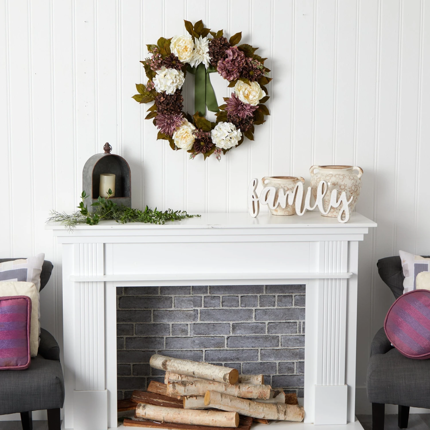 What better way to accent any bare area than with a Peony, Dahlia, and Hydrangea Faux Wreath? Inspired by nature and crafted from high-quality materials, silk blooms mimic mother nature’s beauty in every detail. The ribbon at the center enhances mature, sleek colored flowers. With a diameter of 24″ easily hang in any bare corner or door.”