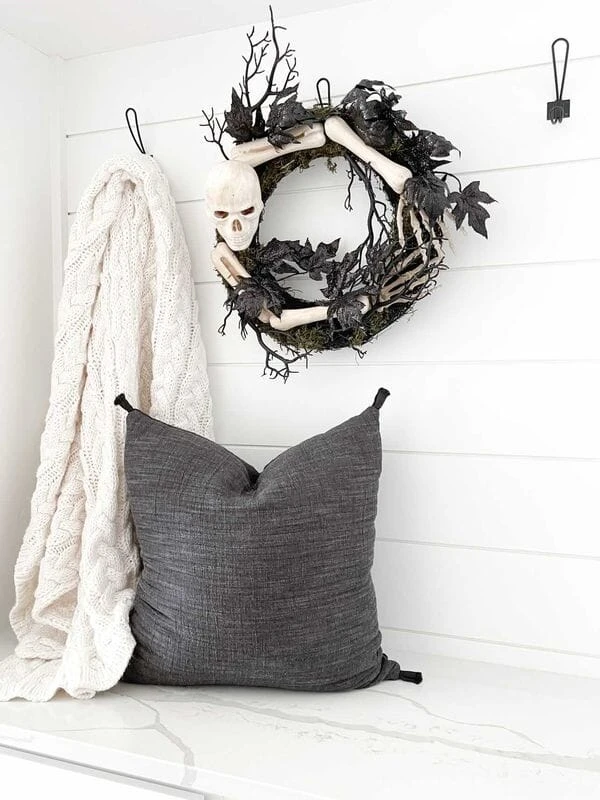 Do you want to scare your guests? Decorate with this Skull and Bones Halloween Wreath for a fun and festive look. A mean skeleton with a body made of maple leaves will protect your house while showing where the cool kids live with a diameter of 24″ house in any bare wall or door.