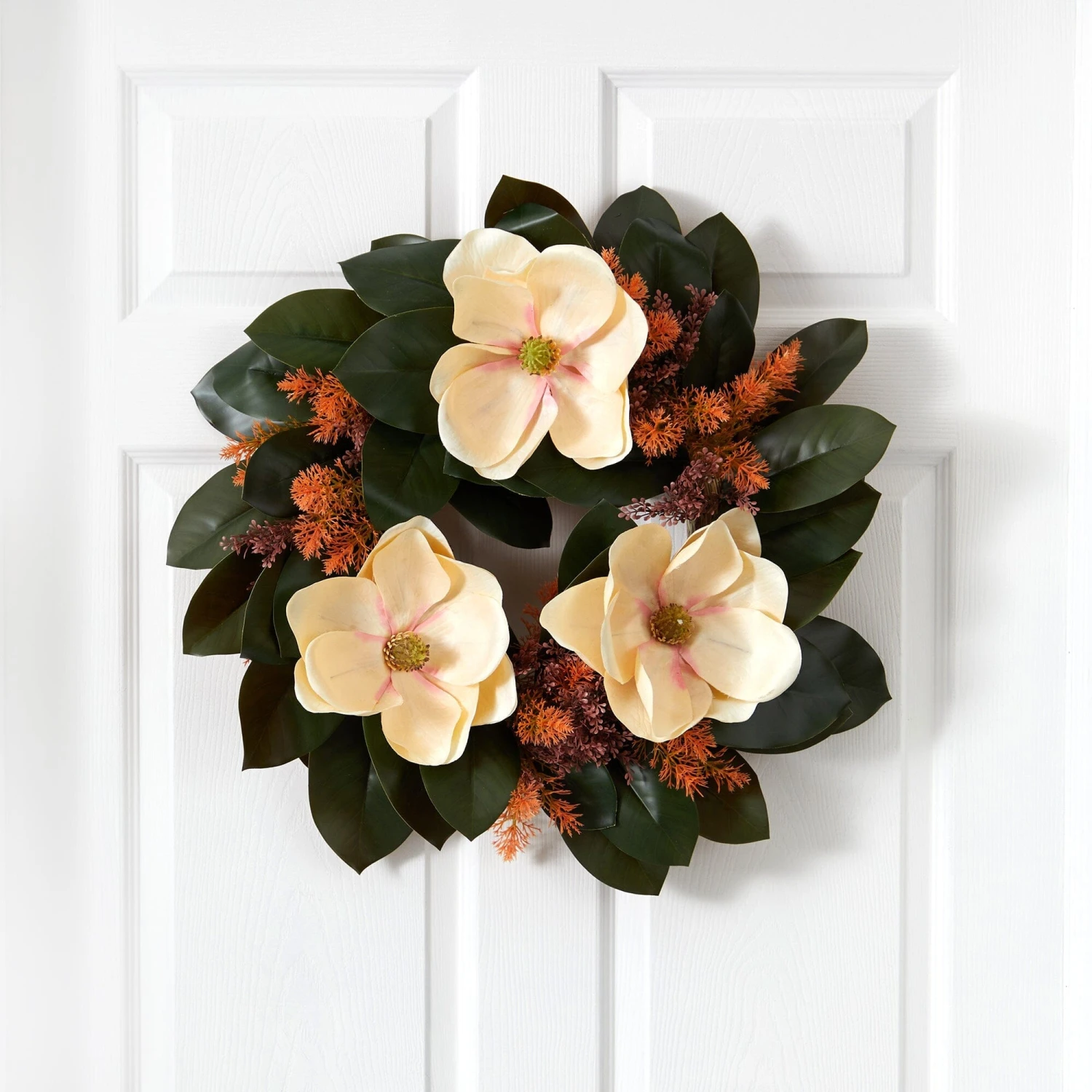 The magnolia is one of the most beloved and recognized trees. So instill those cozy vibes in your home with this Magnolia Artificial Wreath. Inspired by nature, the dramatic leaves accent large flowers for a realistic look. Crafted from high-quality materials, this faux-bulous fall wreath is just as beautiful as a fresh bouquet but brightens your space for a lot longer. With a diameter of 24″, display during any time of year. Ideal for a door or lonely wall.”