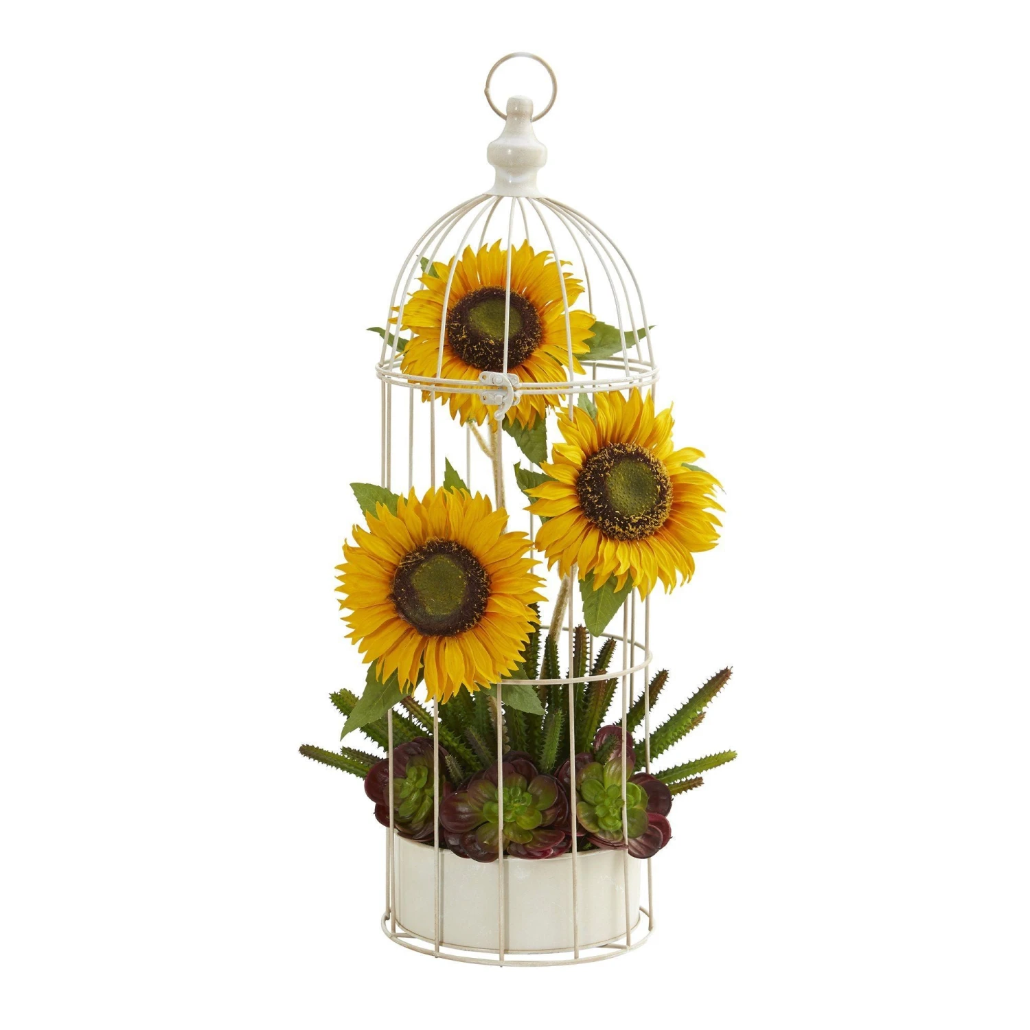 Inject color throughout everyday spaces with the help of this artificial arrangement flaunting a trio of realistic looking sunflowers in bright, sunny hues, accented with various mixed succulents and complementary greenery at the base. Standing 24” high from its decorative cage, this cheerful fake arrangement would brighten even the darkest environments.
