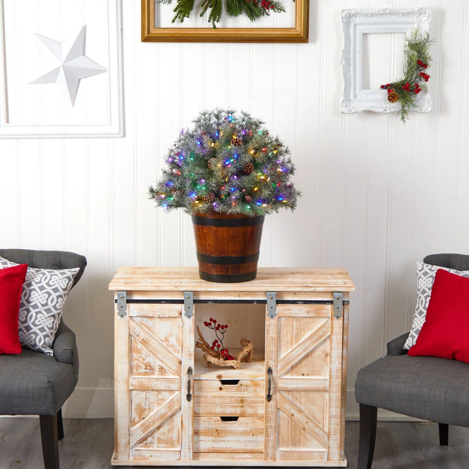 Dare to be different this holiday season with this flocked Christmas Artificial Tree with pinecones. Shrubs of needles are accented by pinecones and 150 multicolored LED lights for a fun and unique detail. Inspired by nature, this flocked tree makes your white Christmas dreams come true, adding a pop of color to make it stand out, and the pinecones bring texture. Standing 26″ from a decorative planter (included in height), house in any tight area. Perfect for a desktop, office or mantel.