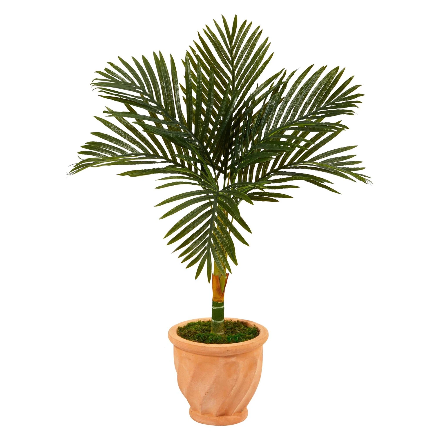 Fancy a fresh, beachy breeze in your home? Recreate a Caribbean beach all year long with this Golden Cane Artificial Palm Tree turning up the heat. Featuring lush iconic palm leaves that stem from a trunk with different textures and colors, display coastal charm. Standing at 3.5′ from its terra-cota planter, bring some greenery to areas that need a breath of fresh air. Decorate in compact living spaces such as corners, apartments or bathrooms. Similar to a vacation, this faux Golden Cane Palm Tree requires zero effort on your part.