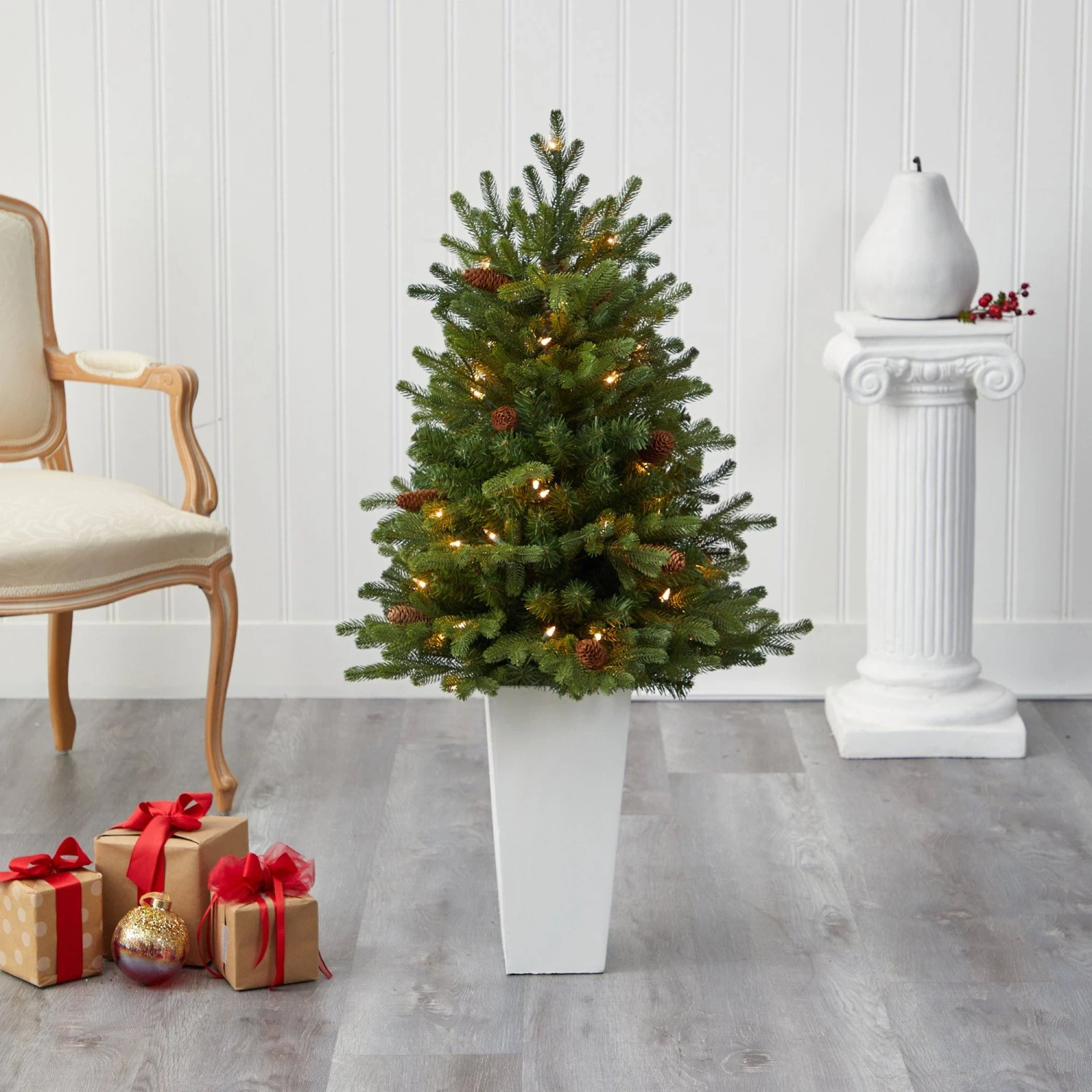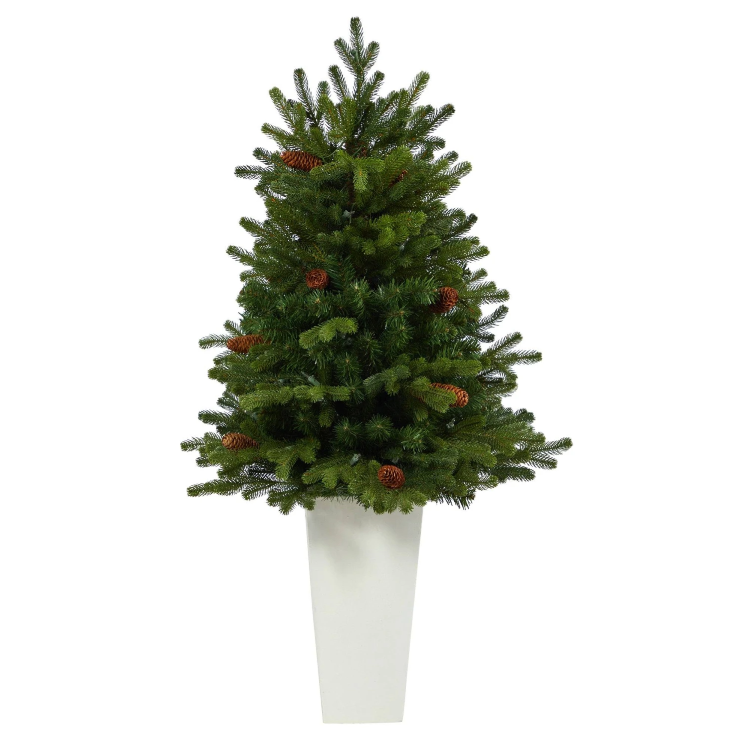 Bring the best of Canada to your home with this Yukon Mountain Fir Artificial Christmas Tree. Incredibly lifelike, this artificial tree is a nod to its natural counterparts and mimics the texture and foliage. Featuring upward sloping, easy-to bend branches – that are accented by faux pinecones – showcase your favorite holiday decorations and shape as you wish. Arriving pre-strung with 50 clear lights, set your home aglow all while saving time and money. Standing at 3.5′ and stabilized in a white planter (included in height), make a statement in compact spaces that need some Christmas cheer. No maintenance or set up!