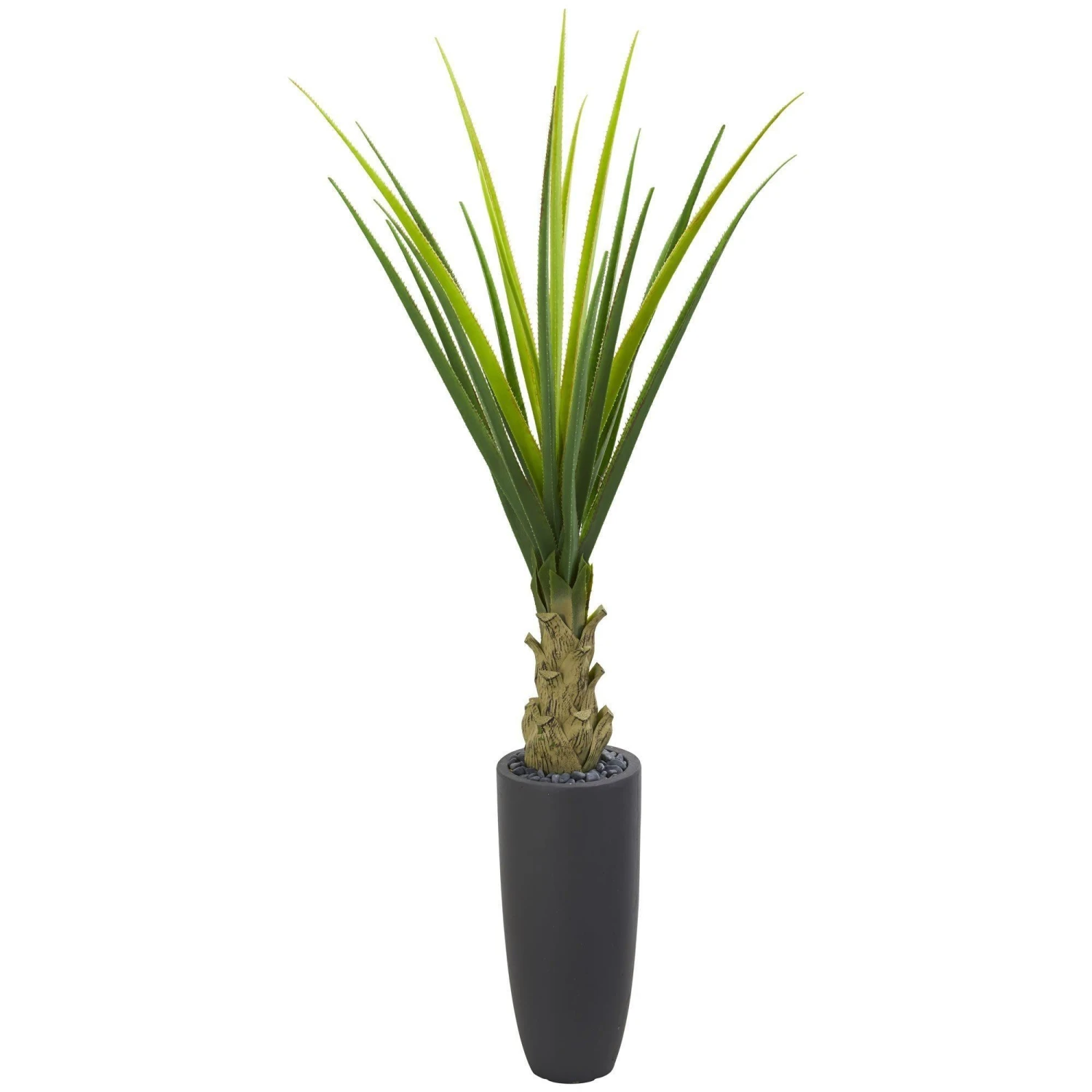 Let this beautiful artificial agave plant bring the warmth of a desert oasis into your home. Standing at 4.5 feet tall, it contains several light and dark green spiky leaves that burst forth from a gray planter topped with river rocks. Place this bold statement piece in your home entryway, near a staircase, or next to a sofa chair in your living room with other succulent plants for a stunning arrangement.