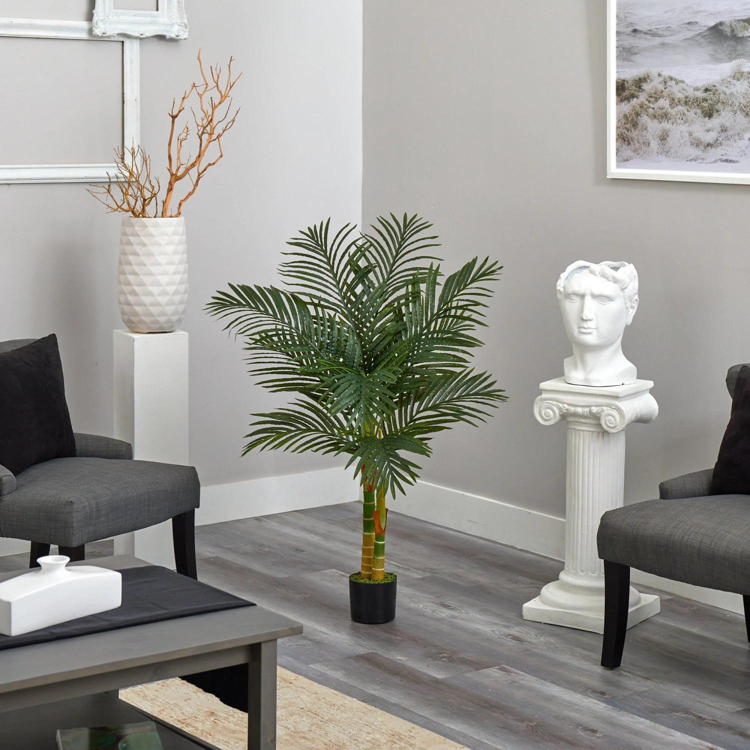 Picture your perfect summer vacation: Where you sun-soak on a hammock, feel the sea breeze hitting your face while sipping on a coconut. Luckily you can now tropic like its hot with this Golden Cane Artificial Palm Tree. It features lush, green leaves and gorgeous golden palm fronds stemming from a bamboo-like trunk with yellow hues. Standing a tall 4’ from a black planter, recreate island life in your sunroom, office (we promise smiling co-workers), or compact spaces. Do you want to feel the sea breeze with this tree?