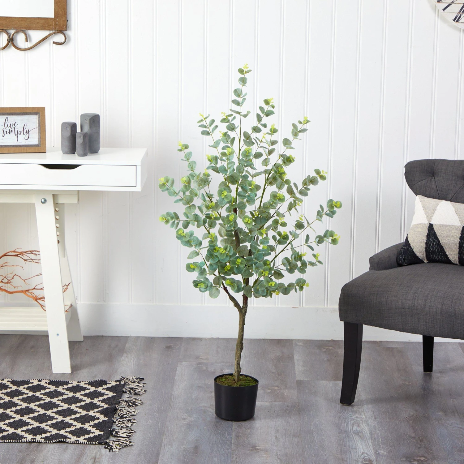 Bring home the essence of the healing Eucalyptus with this artificial plant. Different shades of variegated green leaves stem from a thick realistic looking brown trunk. Native to Australia, add an exotic touch to spaces that need texture and some color. Standing 4’ from a nursery planter, included in height, curate in compact spaces such as apartments, dorms, and awkward corners of bathrooms. Designer tip: Many crafters decorate this plant in tandem with other herbs and mixed greens.