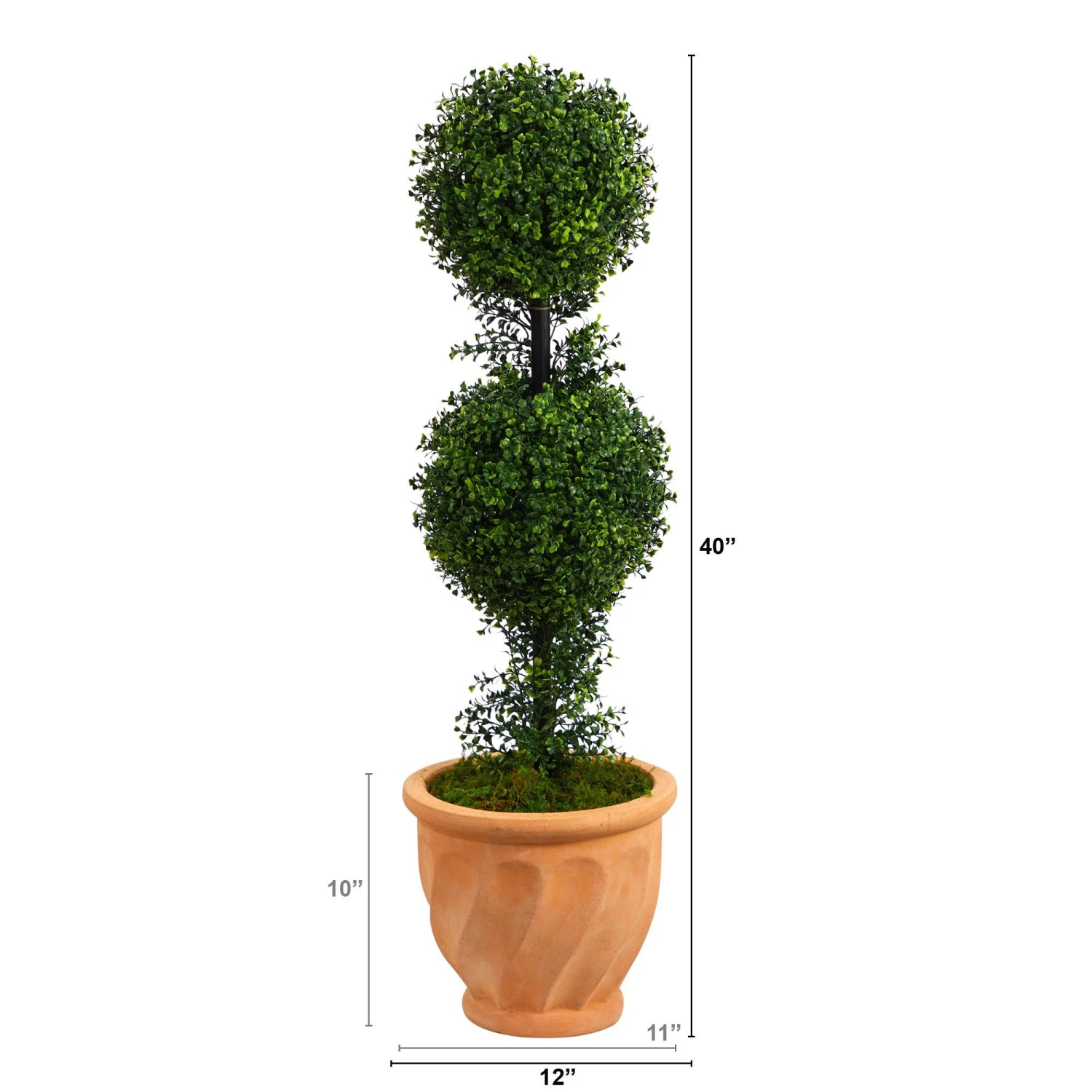 Elegantly greet guests with this double boxwood topiary. Three perfectly trimmed boxwood balls sit in synergy and are made of realistic-looking boxwood foliage. You can now enjoy the sophistication of the boxwood without maintenance or care. Standing 40″ from a terra cotta planter (included in height), curate in compact spaces. Perfect for an apartment, bathroom, room corner, or foyer.