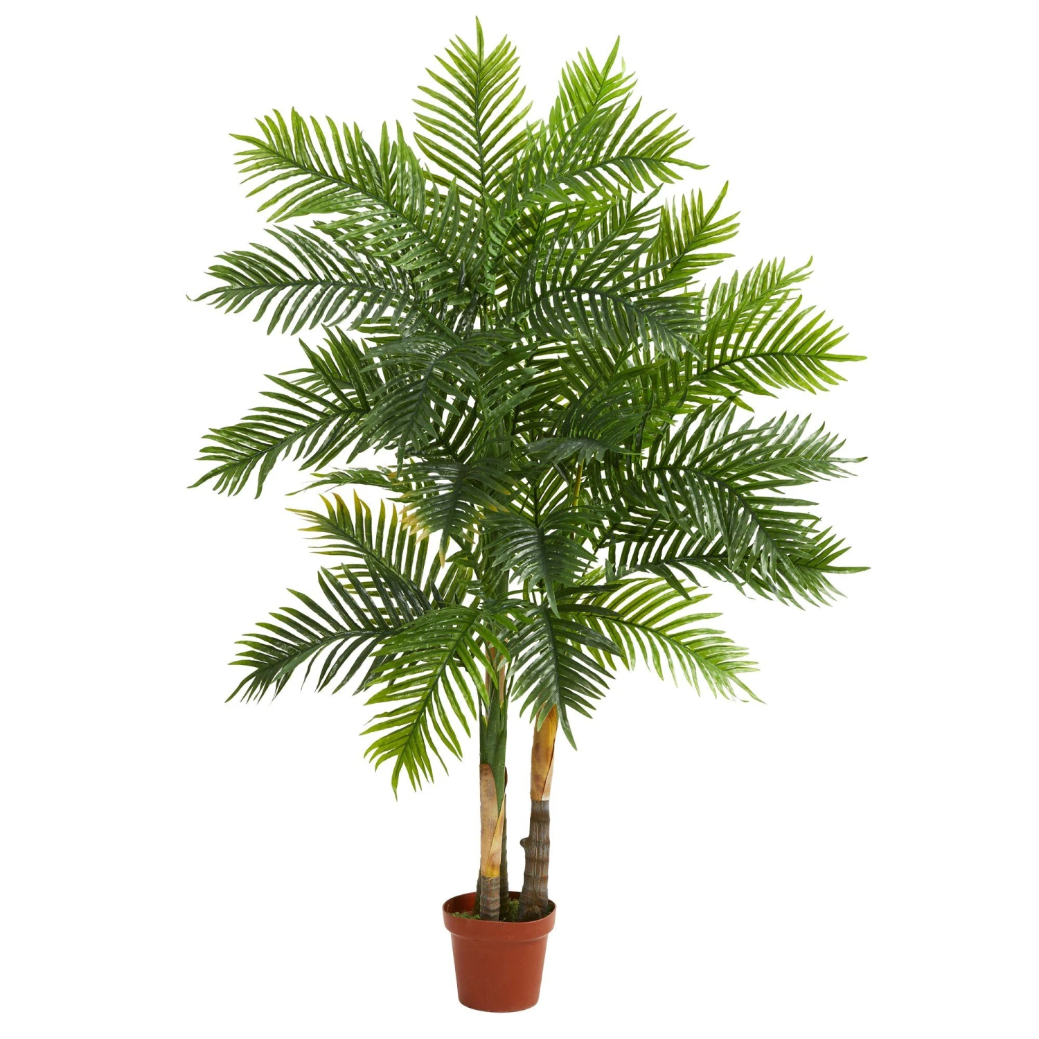 Make and shake a splash with this green fountain full of leaves, greeting your home like its summer all year. Designed to recreate your favorite seaside shore adventures, glee with feather-like, thick variegated , arching palm leaves that stem from 3 matured mixed colored trunks. Standing 5’, place in your room corners, office, or bedroom for some freshness. Perfect for any space no matter the style decor.
