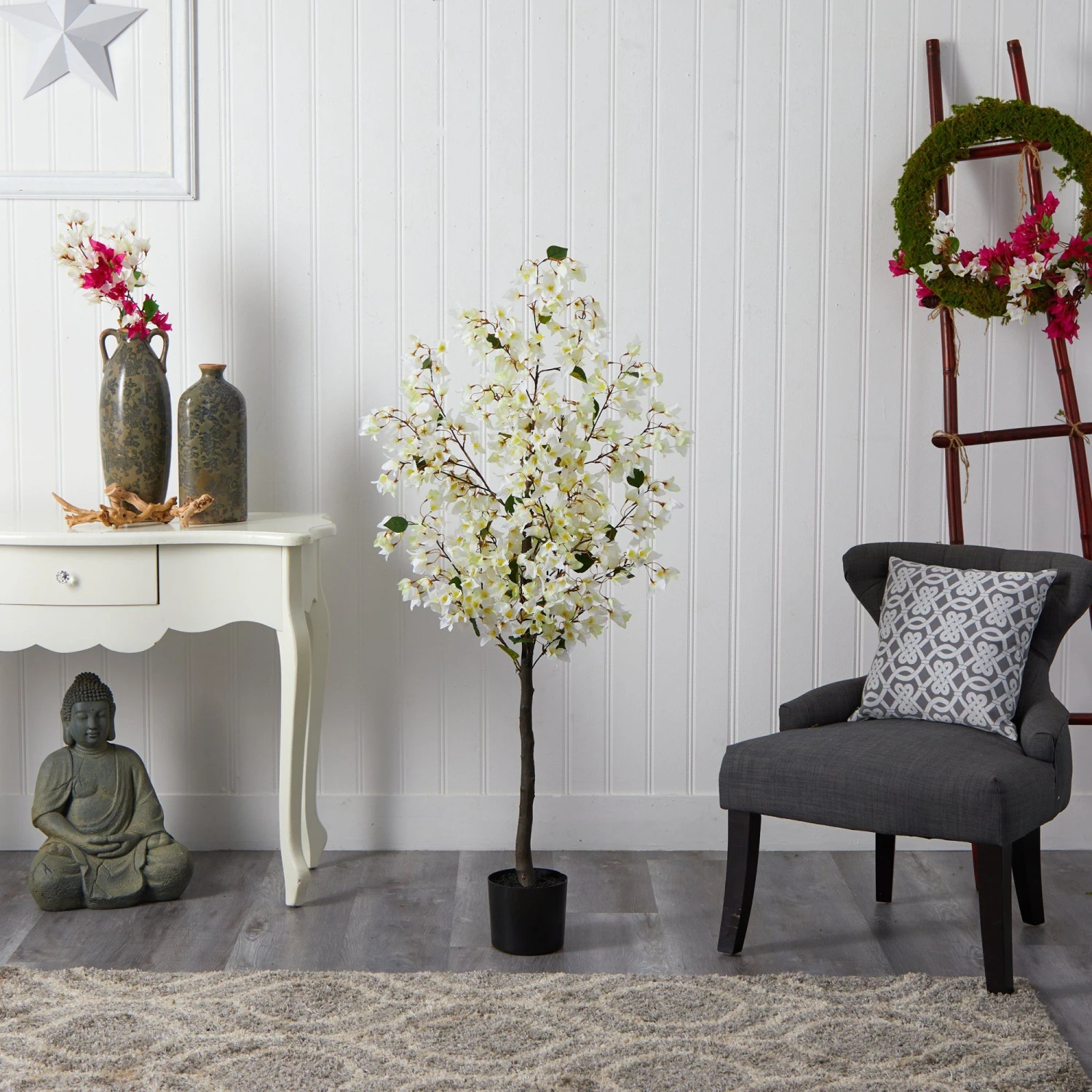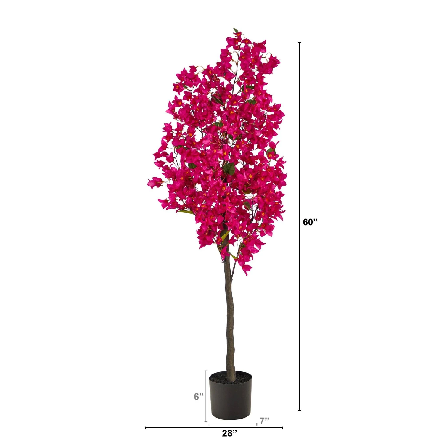 If you feel like showing your true colors, feel pretty in pink with this Bougainvillea artificial tree. A palette of vivid colored flowers stem from a realistic brown trunk. Inspired by nature, the lifelike flowers will brighten and refresh any corner. Standing at 5′, from a nursery planter, bring a feminine touch with vibrant flowers. Designed and approved by horticulturists, display in any room that needs to bloom such as bathrooms, home offices or kitchens.