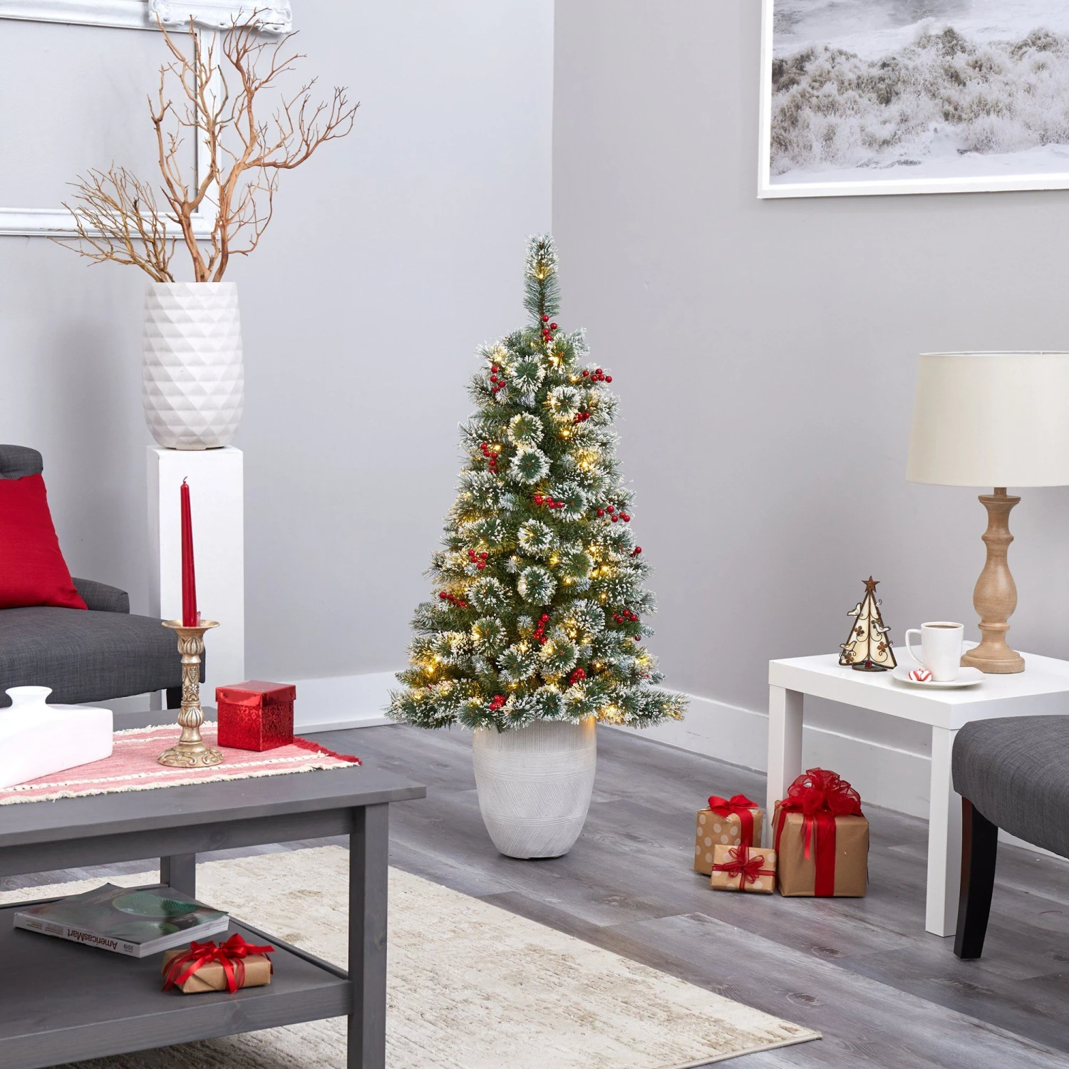 Have a berry merry Christmas with the help of this frosted Swiss Pine Artificial Christmas Tree. Inspired by nature, this robust silhouette mimics the real natural foliage and texture found in their counterparts with snow in the easy-to-bend branches. Arriving pre-strung with 100 clear LED lights for a warm, candle-like glow – this cute artificial Christmas tree also comes dressed from top to bottom with faux berries. Standing 50” from a white planter (included in height) this tree requires zero maintenance and it’s an easy setup. All that’s missing is your decorations. Perfect for compact spaces that need some holiday cheer.