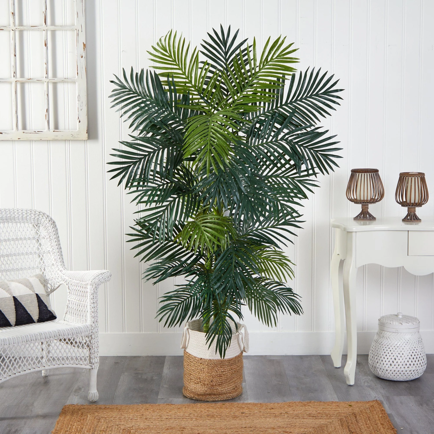 Picture your perfect summer vacation: Where you sun-soak on a hammock, feel the sea breeze hitting your face while sipping on a coconut. Luckily you can now tropic like its hot with this Golden Cane Artificial Palm Tree. It features lifelike lush, green leaves and gorgeous golden palm fronds stemming from a bamboo-like trunk with yellow hues. Standing 6.5′ tall from a jute planter(included in height), this faux Golden Cane Palm Tree will recreate island life in your sunroom, office (we promise smiling co-workers), or guest room. Do you want to feel the sea breeze with this tree?