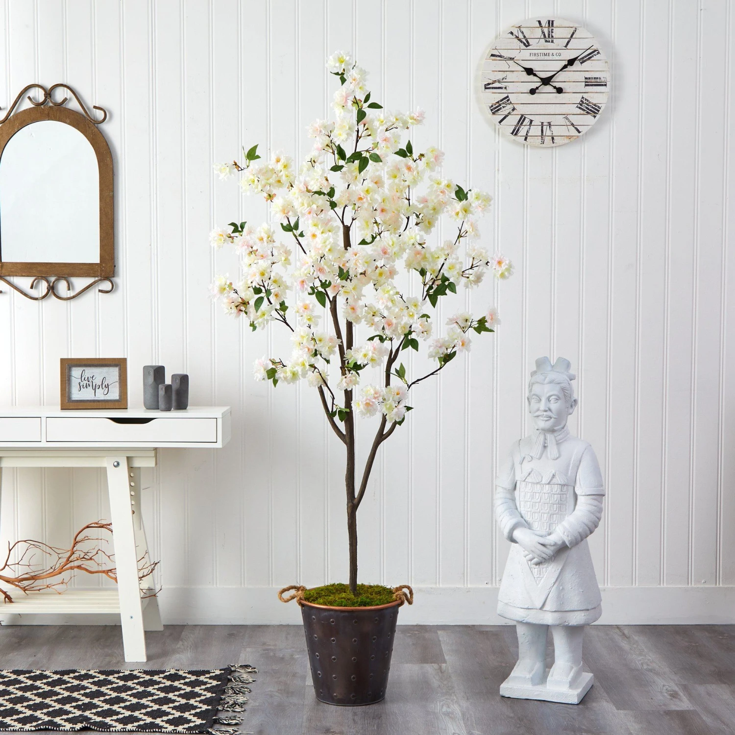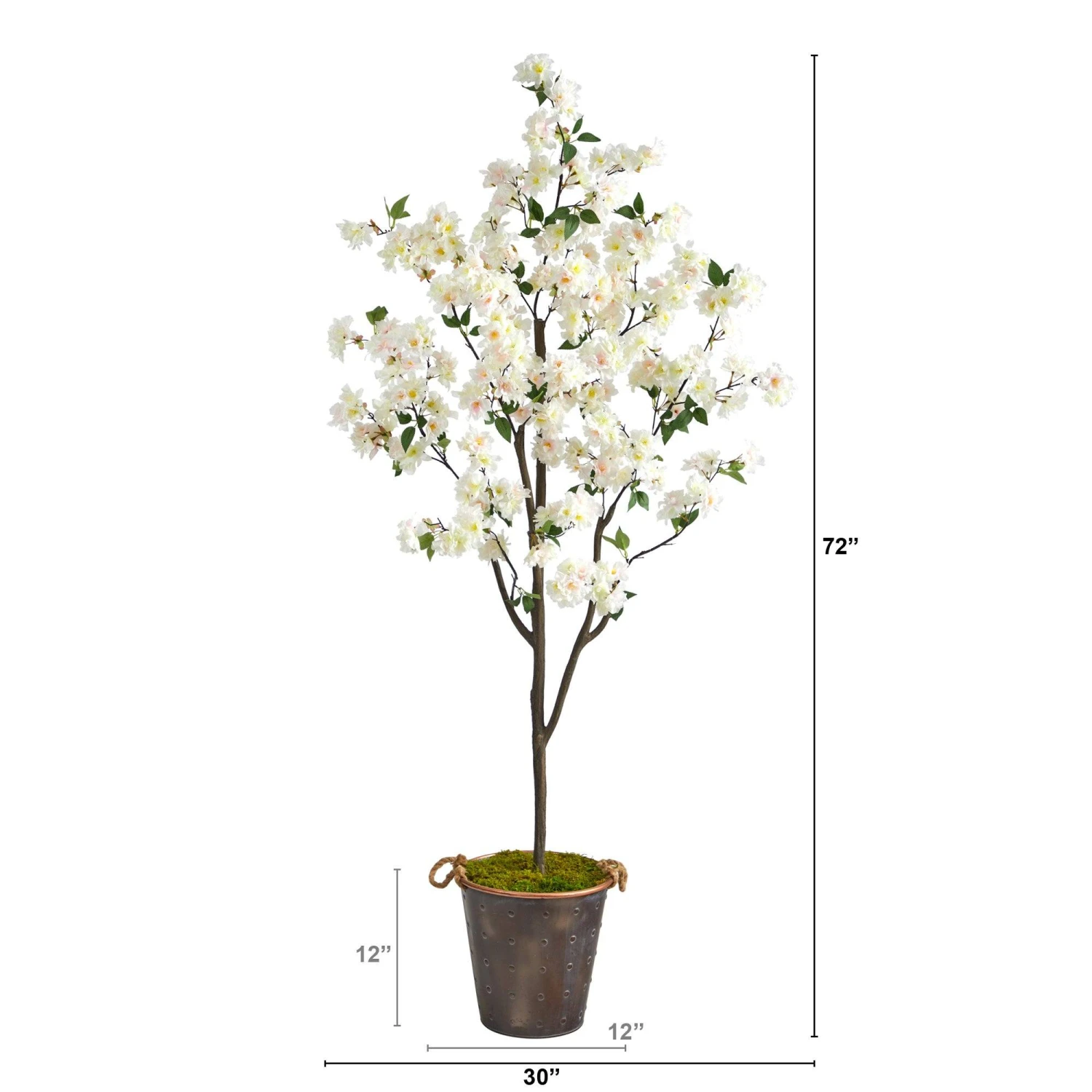 Enjoy the wonders of the majestic spring awakening with this Artificial Cherry Blossom Tree. Incredibly lifelike pink cherry blossom flowers adorn a slim, brown trunk in a rhythmic melody of white foliage for a full look that will instantly transform your home into the best of Japan. The white flowers have shades of pink and are accented by green leaves for a feminine touch that softens spaces. Standing 6′ from a decorative metal pail with rope, curate in tight areas that want to feel pretty in pink. Perfect for bedrooms, bathrooms, awkward corners, or kitchen nooks.