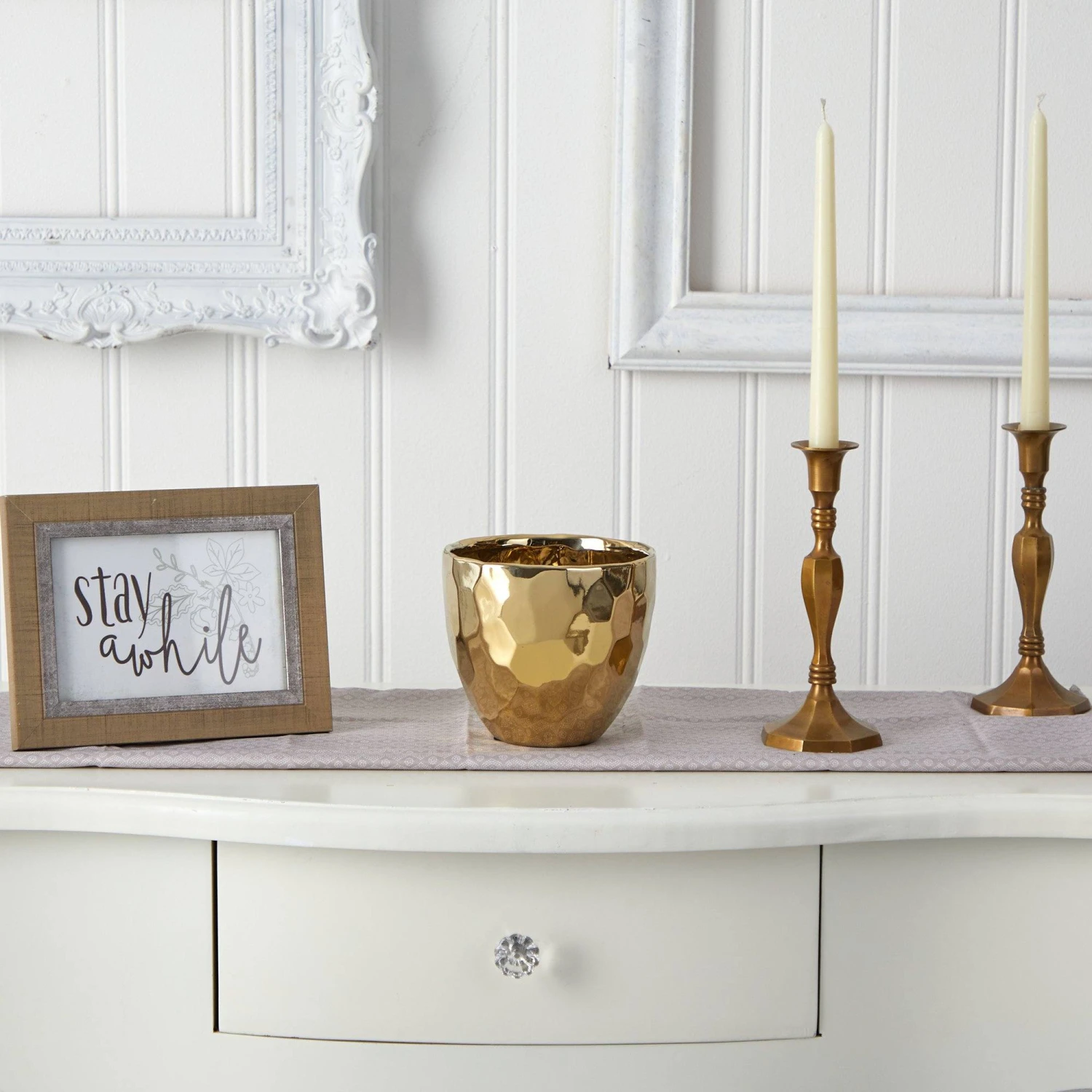 Add some glam to your space with this Designer Gold Bowl. If you want to bring attention to your greenery, look no further. Texture, color, and glare all in one. Perfect for Hollywood glam, modern, and many other décor styles. Reaching 6″ in width, this bowl will attract attention wherever displayed. House hydrangeas, roses or other flowers.