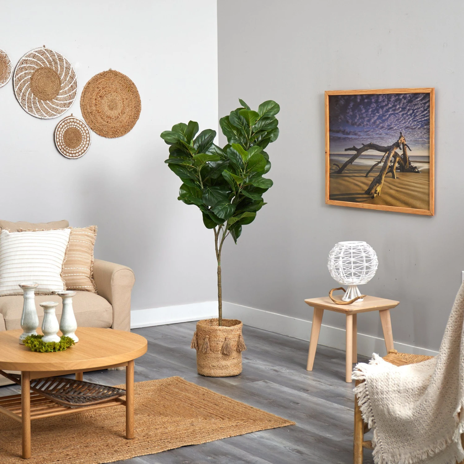 Fiddle Leaf Figs are the “it” plant from the bunch. If you’ve tried growing one indoors, you know how difficult it is. Luckily, you can trick all your friends into thinking you can care for one with this Fiddle Leaf Fig artificial tree. Inspired by nature, large glossy Fiddle leaves have naturally occurring details throughout. Assembled from high-quality materials, feel free to bend the branches to fit in your space. Standing 6′ from a boho chic jute planter, house in any area. Perfect for a living room, bathroom, or awkward corner.