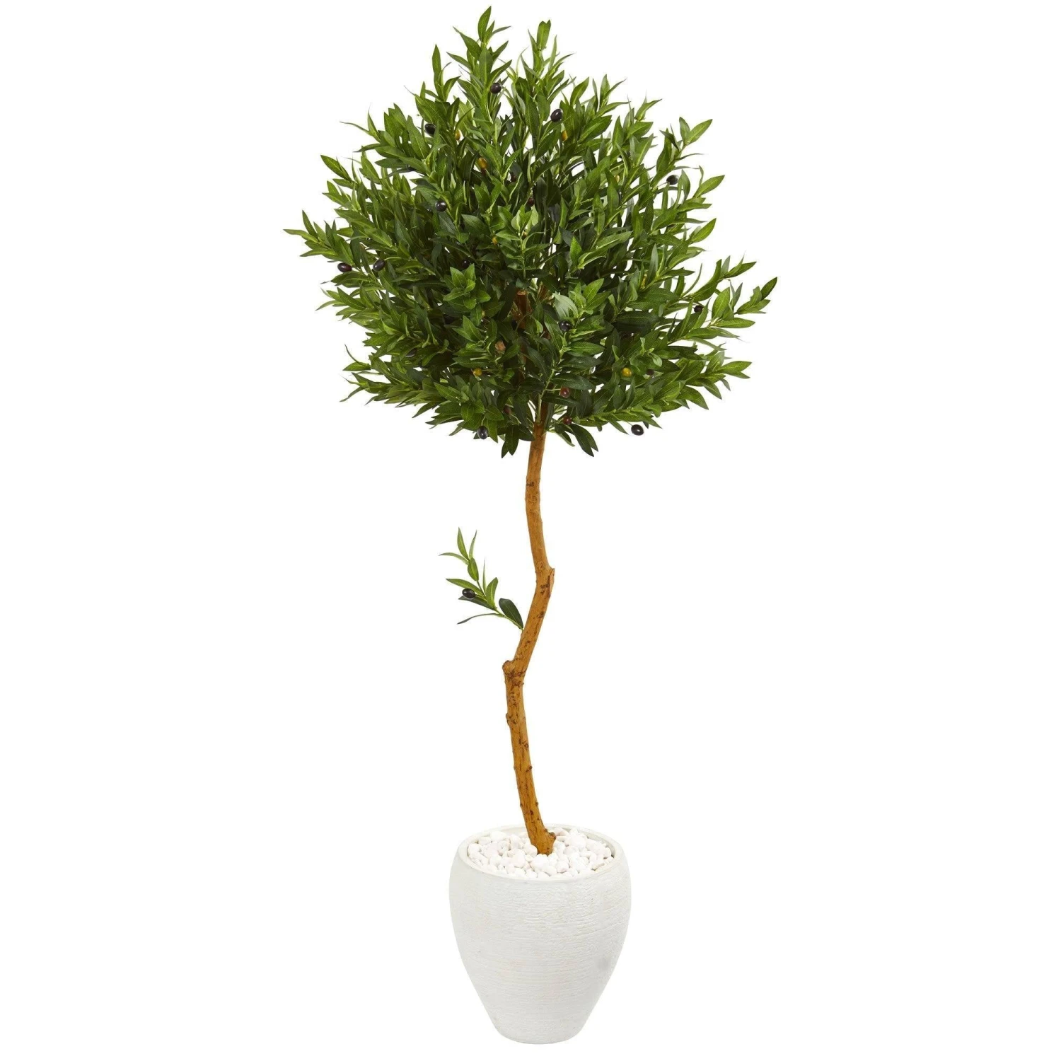 A thin stem emerges from a white planter topped with white river rocks with this 63” olive topiary artificial tree. On top of the stem sits many green leaves that are outdoor-safe allowing for this artificial tree to be used as an outdoor decoration. Settle this piece next to your backyard patio’s table to highlight this furniture piece. Pair it with a colorful flowering plant as a centerpiece on the table for a beautiful finish.