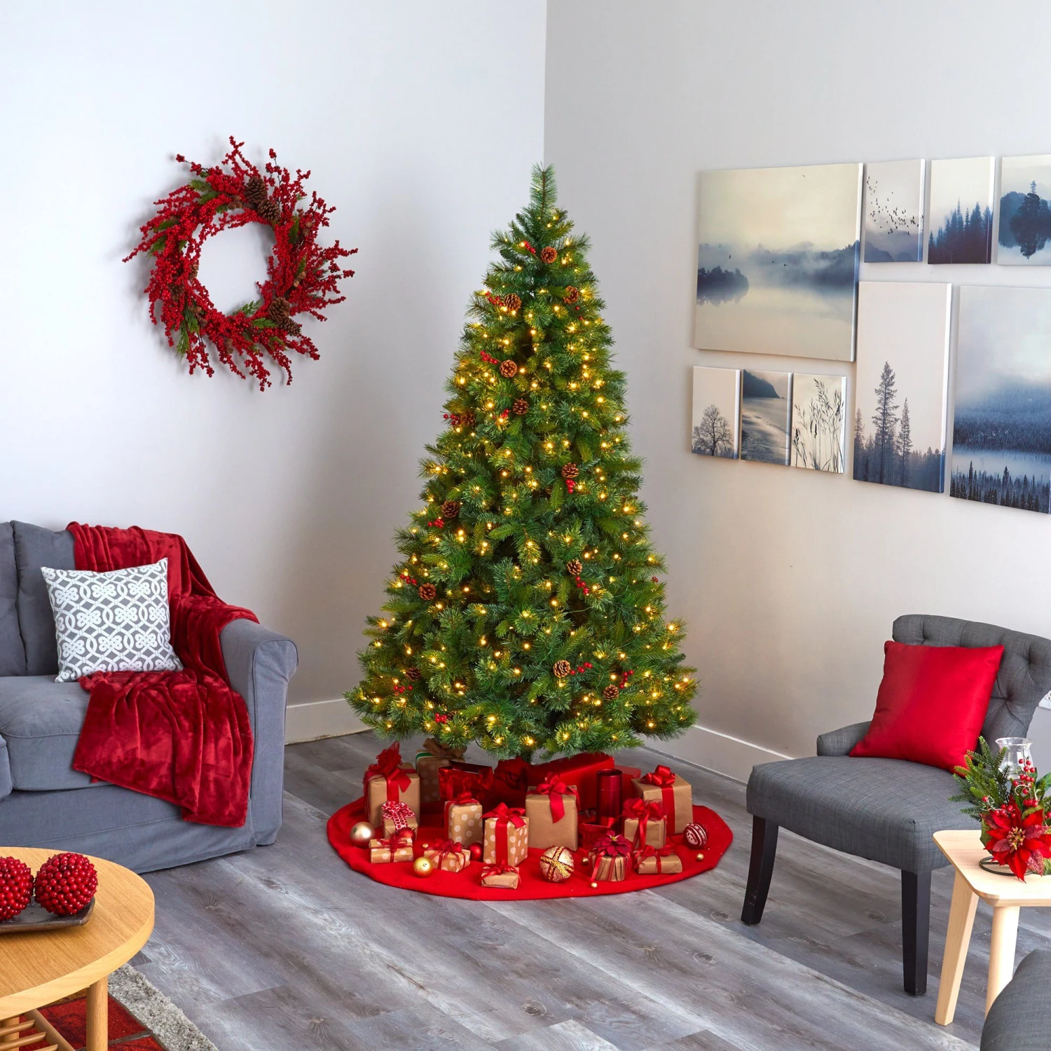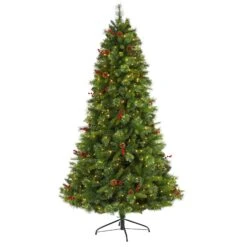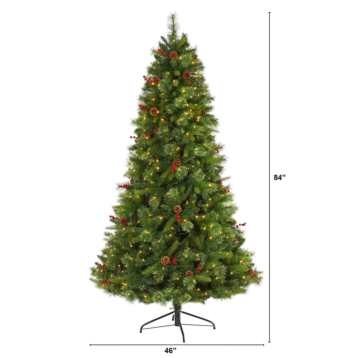 Create a picture-perfect Christmas setting in your home or office with this evergreen artificial Christmas tree. Easy and effortless, this artificial Christmas tree boasts a traditional silhouette of seasonal foliage made up of easy-to-bend branches, accented throughout with faux pinecones and holly berries – all of which looks incredibly realistic. Arriving pre-strung with 500 clear LED lights to eliminate unsightly tangles and carefully stabilized on a metal stand, this joyous 7’ artificial Christmas tree will complement a range of holiday decor schemes, year after year.