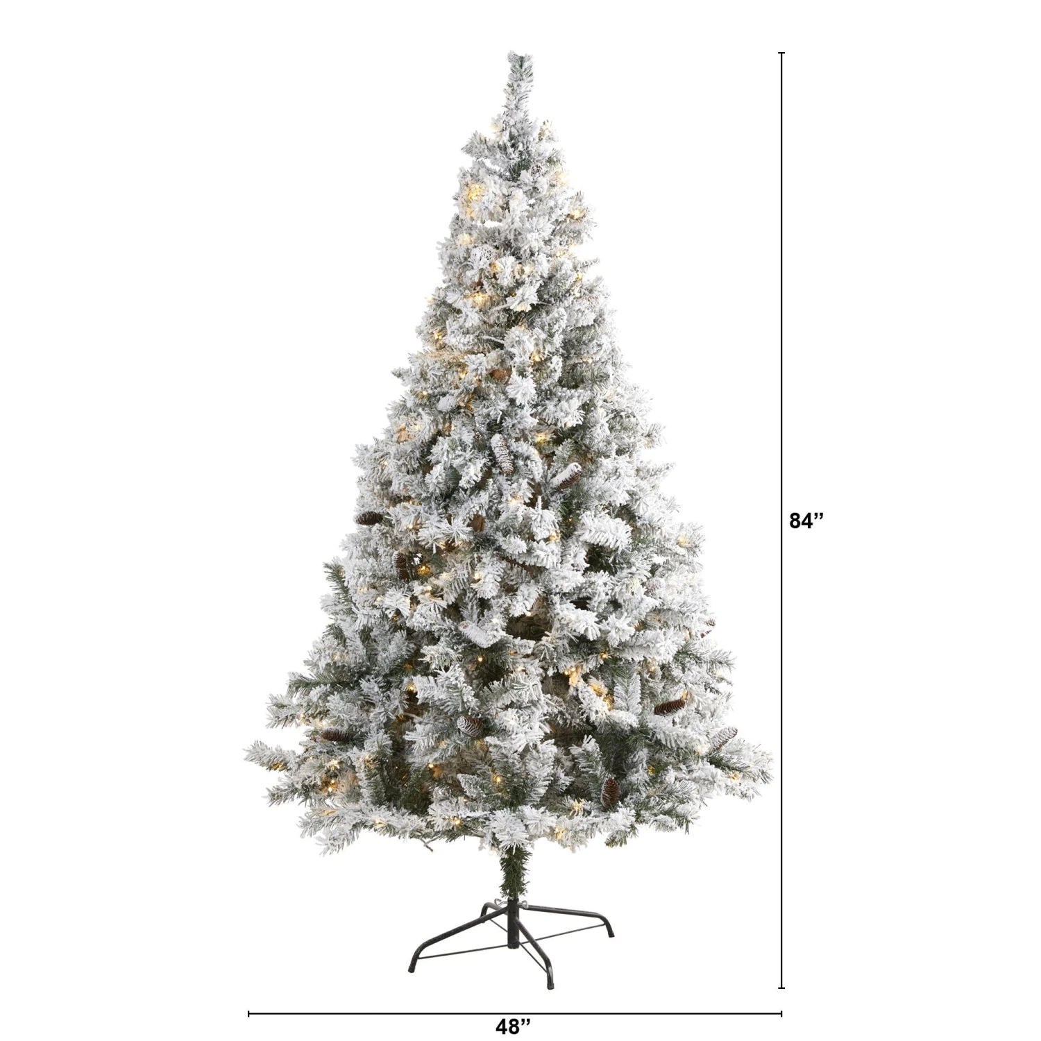 Create a picturesque Christmas this holiday season with the help of this Flocked White River Mountain Pine Artificial Christmas Tree. Easy to set-up and entirely maintenance-free, this winter-inspired Christmas tree boasts a robust collection of realistic looking foliage consisting of 868 easy-to-bend branches for showcasing holiday accents and accented throughout with faux pinecones that look incredibly realistic; it comes finished with a light frosting of faux snow to evoke the ultimate winter wonderland. Arriving pre-strung with 350 clear LED lights for stress-free decorating and carefully stabilized on an accompanying stand, this handsome 7’ tall frosted artificial Christmas tree will undoubtedly transform any home or office into a joyous holiday setting for years to come.