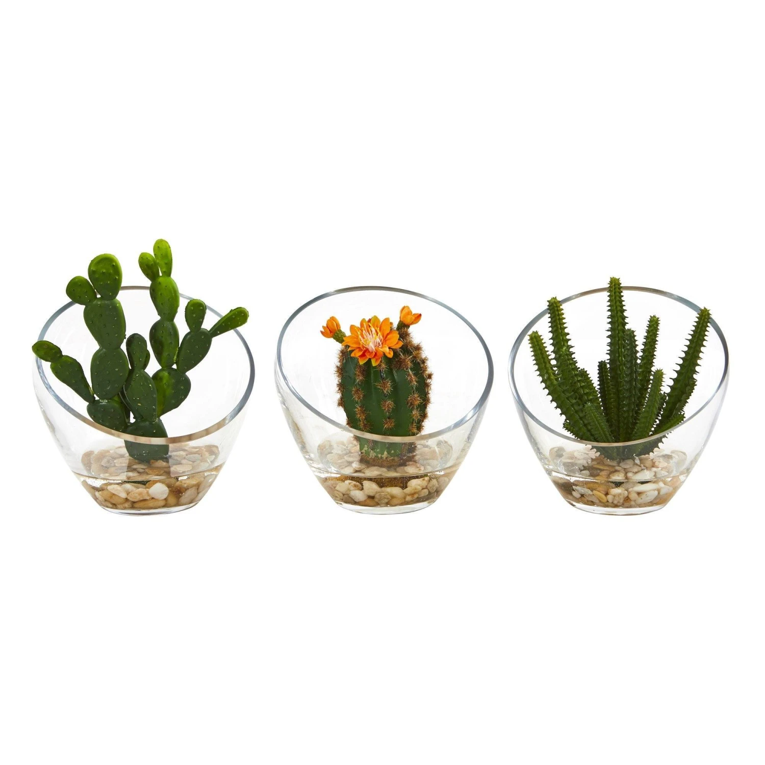 Incorporate southwestern charm to your decor scheme with this set of three artificial succulents; each a unique variation with lifelike characteristics, this charming trio would look beautiful displayed together or individually. Reaching 7” high from their own glass vase, they’re perfect for aligning on a shelf or dresser.