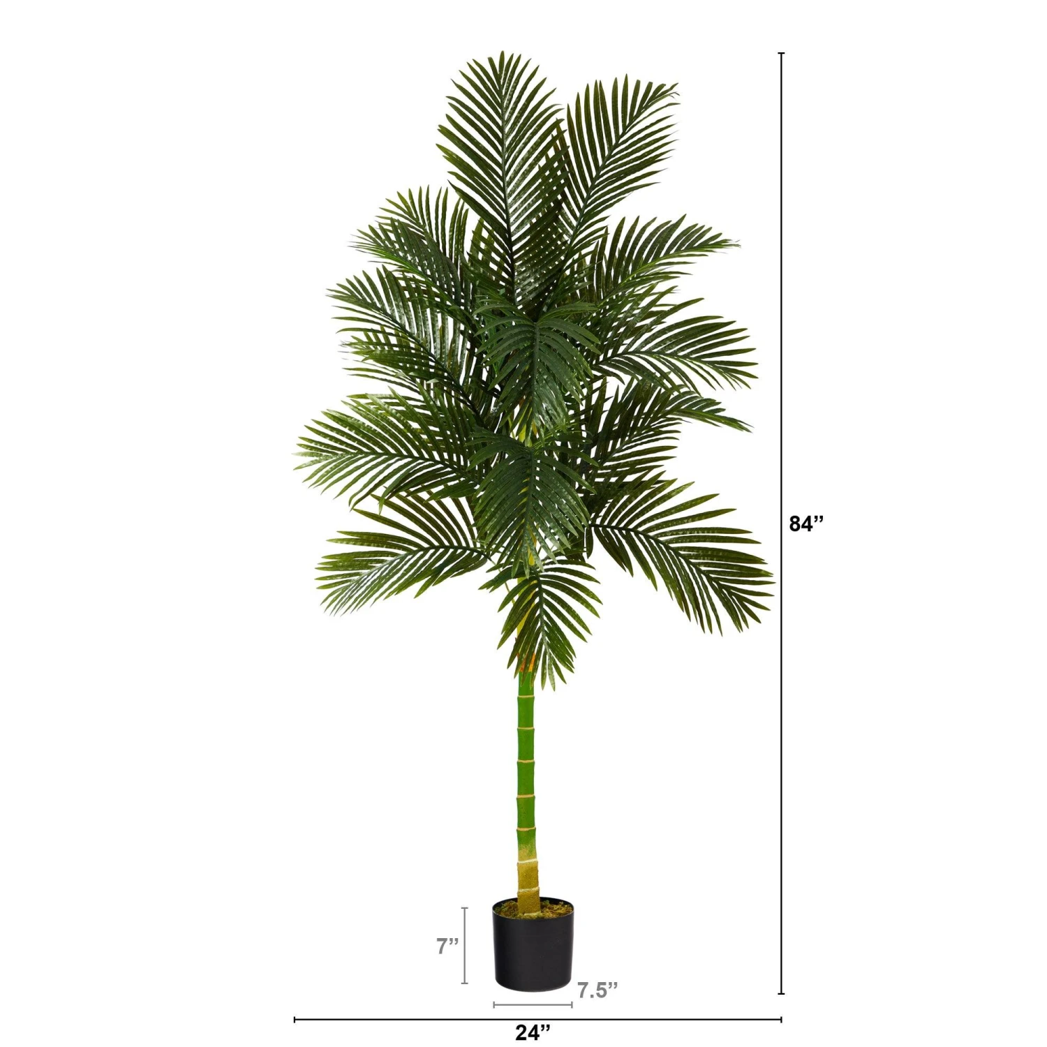 Picture your perfect summer vacation: Where you sun-soak on a hammock, feel the sea breeze hitting your face while sipping on a coconut. Luckily you can now tropic like its hot with this Golden Cane Artificial Palm Tree. It features lush, green leaves and gorgeous golden palm fronds stemming from a bamboo-like trunk with yellow hues. Standing a tall 7’ from a black planter, recreate island life in your sunroom, office (we promise smiling co-workers), or guest room. Do you want to feel the sea breeze with this tree?