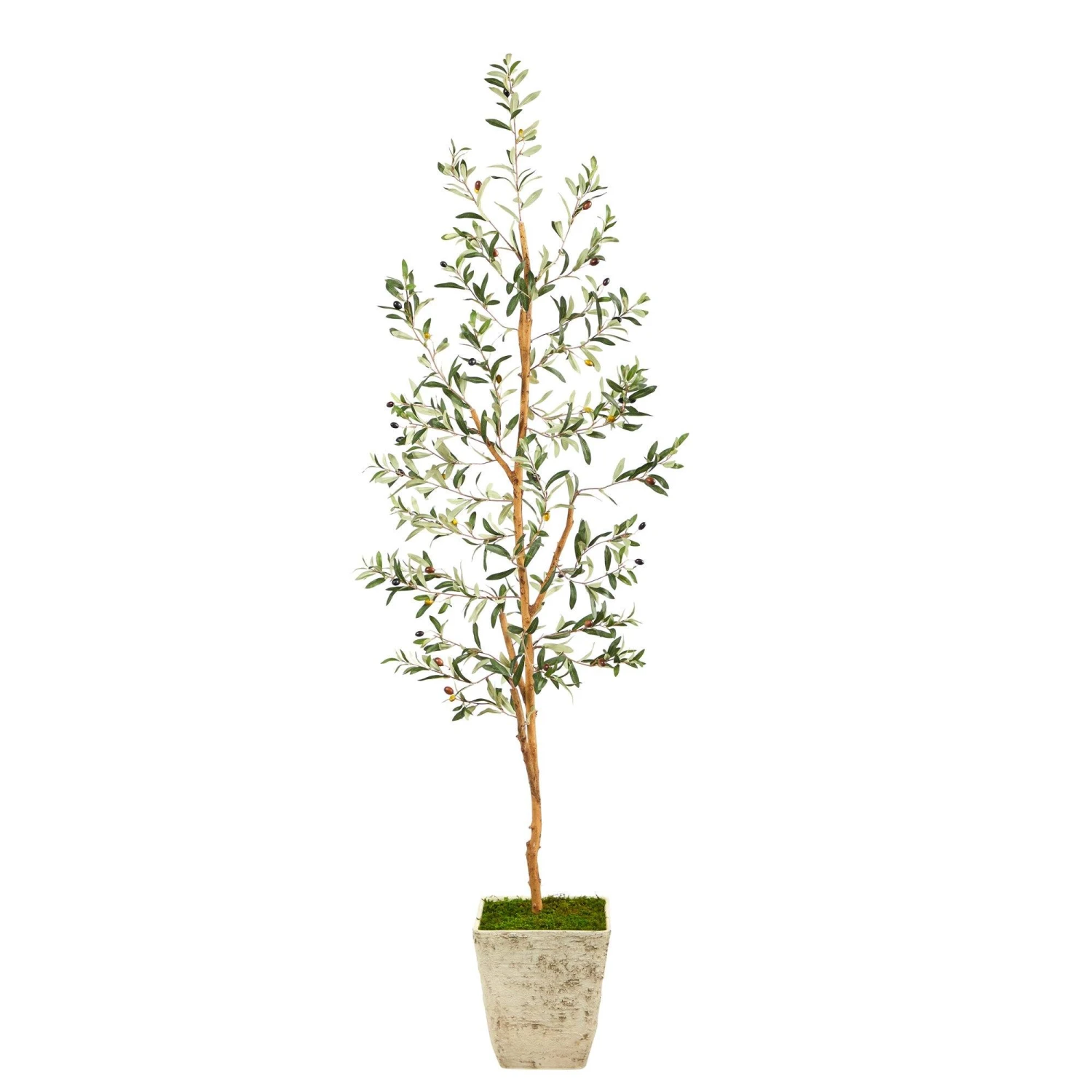 Bring the charm of the Tuscan countryside with this Olive Artificial Tree. Delicate thin stems branch out from a slim brown trunk, elegantly showcasing airy green olive leaves – that are accented by faux olives so realistic you’ll want to eat them. If you love the Mediterranean’s romantic charisma, but don’t have a green thumb, rejoice! Maintenance-free and housed in a country white planter with faux moss, this 70″ (height includes planter) is a Bello addition for compact spaces. Curate in apartments, low ceiling areas, or bathrooms and bring symmetry to your rooms.