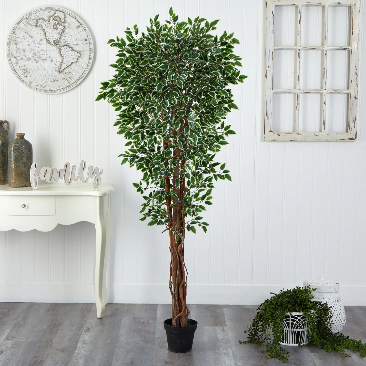 Make an elegant statement in your living areas with this Ficus Artificial Tree. A symphony of variegated Ficus leaves ranging from light to dark green stem from thin, easy to bend branches, creating a full look. The twisting trunks are incredibly lifelike because they’re made from natural trunk. Stands 70″ and is UV resistant, making it safe for outdoor use.. Perfect for foyers, backyards, awkward corners, and bathrooms. Complements many décor styles.
