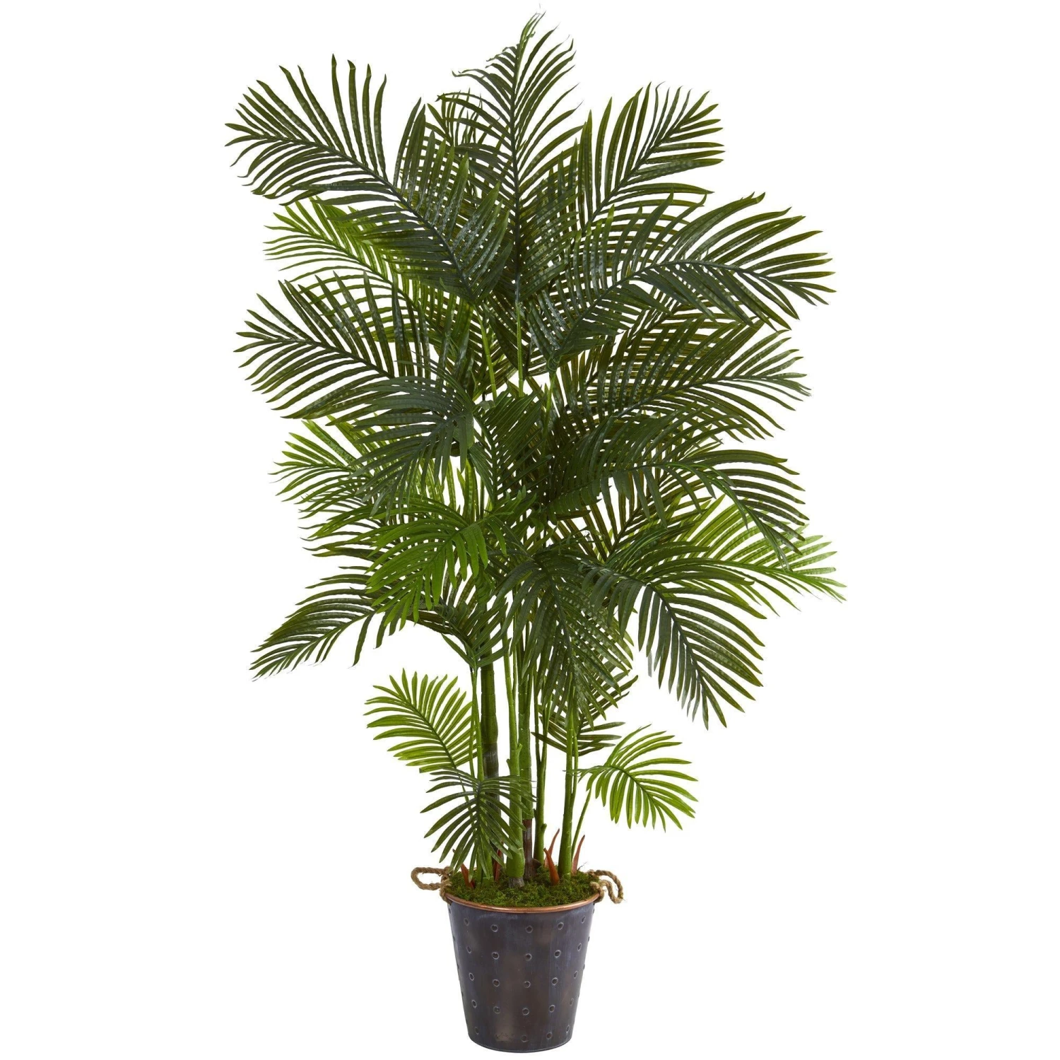 Effortlessly transform a bare space in your home or office with the help of this artificial tree boasting a rich, lush overgrowth of areca palm foliage in bright, vivid hues, intricately designed from the finest materials to evoke a lifelike quality. Standing 75” high from a decorative metal pail with rope, this realistic looking fake tree will inject instant freshness wherever displayed.