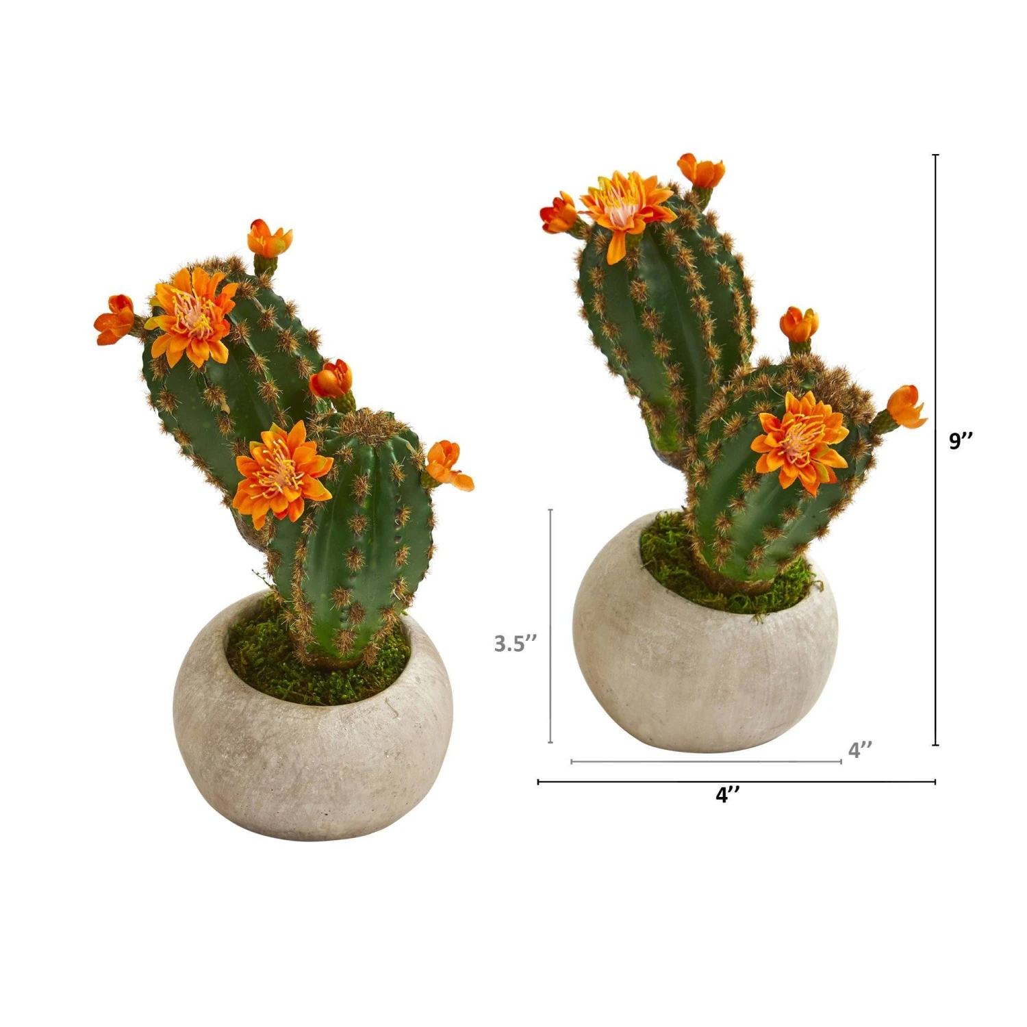 Channel the beauty of the southwest with a set of artificial flowering cacti. Arriving in a set of two, each 9” artificial cactus is designed with lifelike qualities – from its unusual oval shape to the minute details on its flowering buds in bright hues. Balancing color and texture, each stands 9” tall from individual stone gray planters.