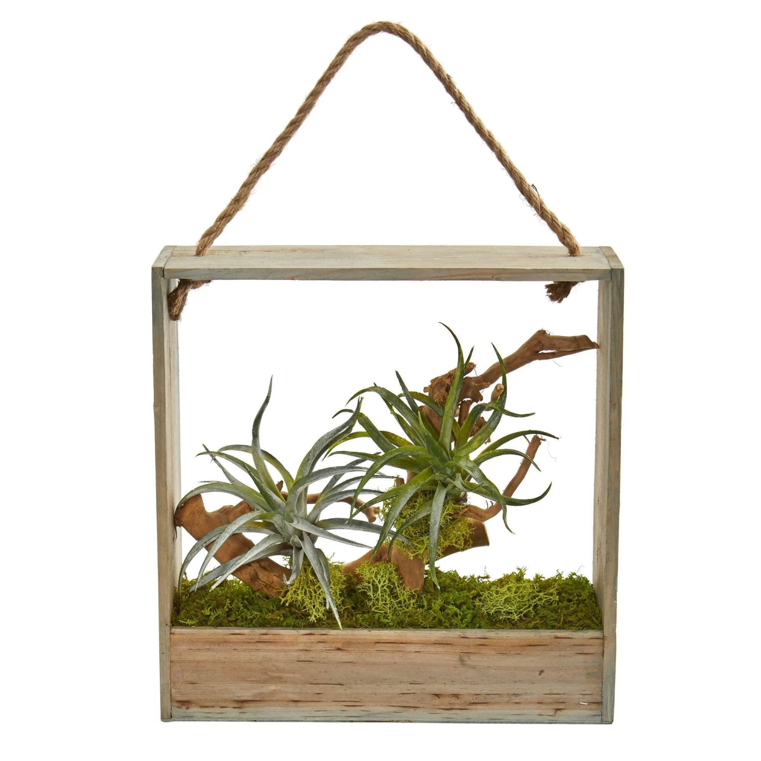 This artificial succulent air plant arrangement has a realistic appearance and will offer the natural beauty of a real plant without the upkeep. A lifelike branch is settled next to thin, feather-like leaves, all nestled in a vintage-inspired decorative hanging frame. It can be placed on a tabletop or hung on a bland interior wall next to a mirror and picture frame in your hallway, entryway, or loft. A bed of natural moss comes included for an added touch of realism.