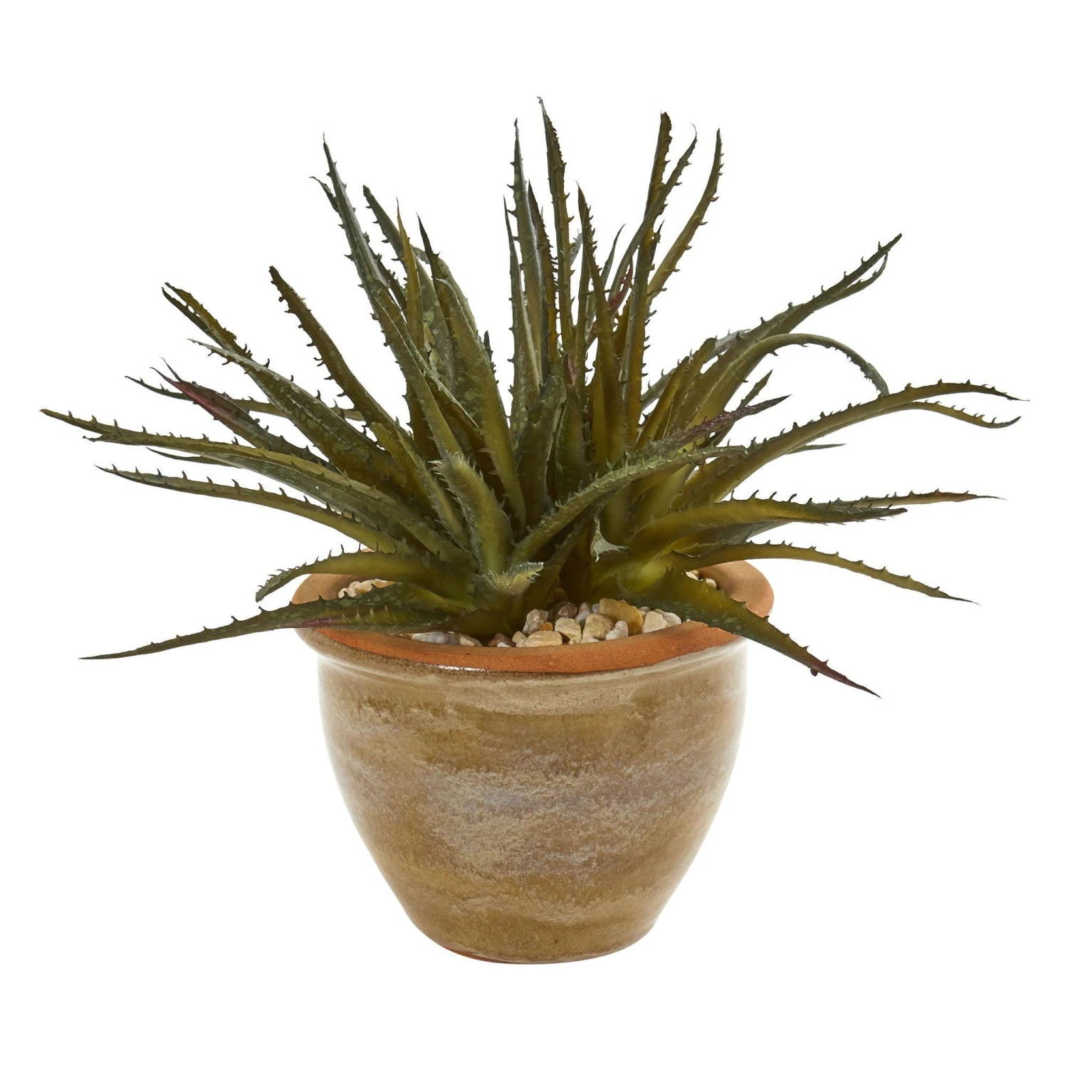 Green foliage complements succulent stems with this 10-inch aloe and cactus succulent artificial plant. Coming together as a pair, they’re both fixed within a ceramic vase. Small in size, these pieces can be used to dress up any area of your home, even those that contain limited space. Place them on top of a built-in wall shelf or on your computer desk for a Southwestern-inspired look.