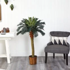 4′ Kentia Palm Artificial Tree In Boho Chic Handmade Cotton & Jute White Woven Planter
