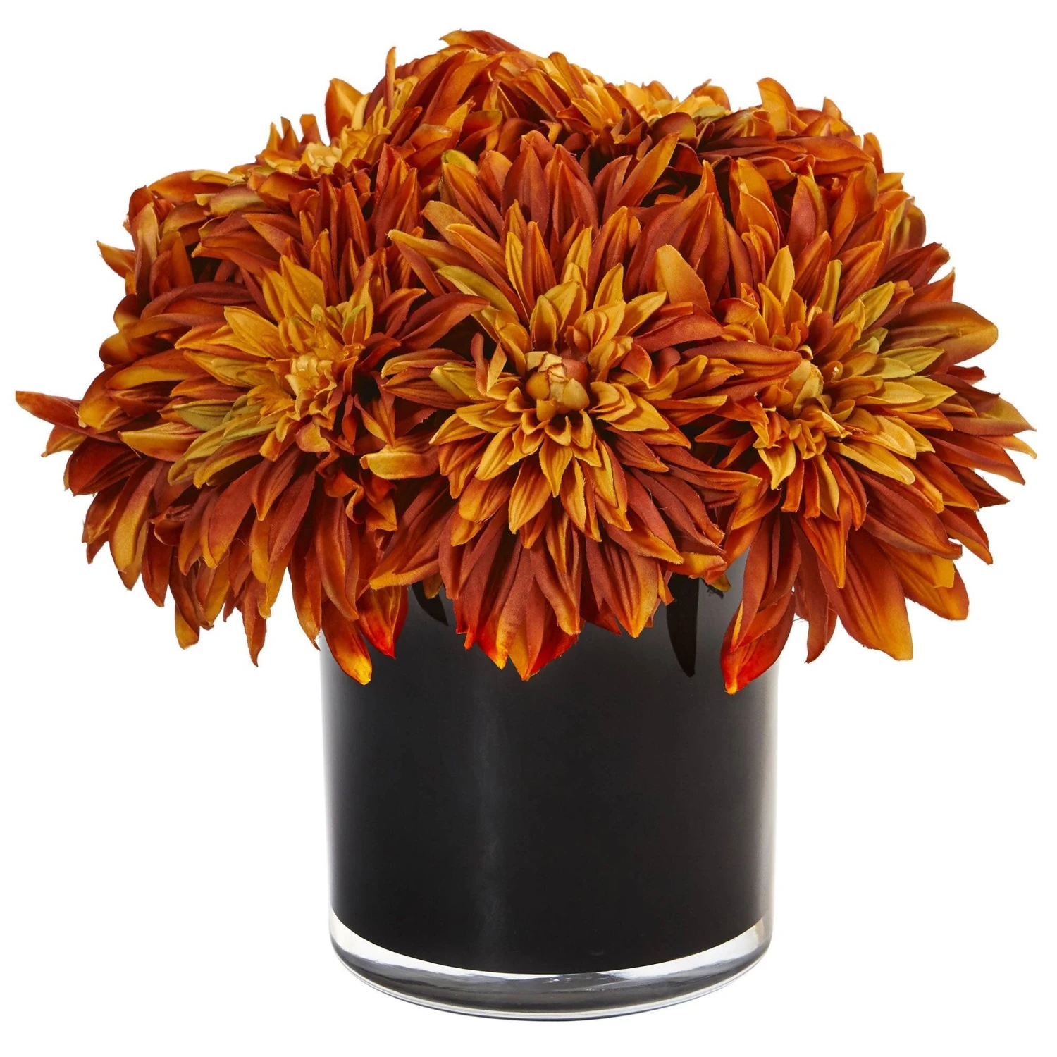 The dahlia mum’s dramatic, big blooms make quite the statement, and this faux arrangement is no different. The large flowers flow up and out of the glossy black planter that’s included with it. An attention -getter when placed anywhere, it really makes a power play when used in an office or as a table centerpiece.