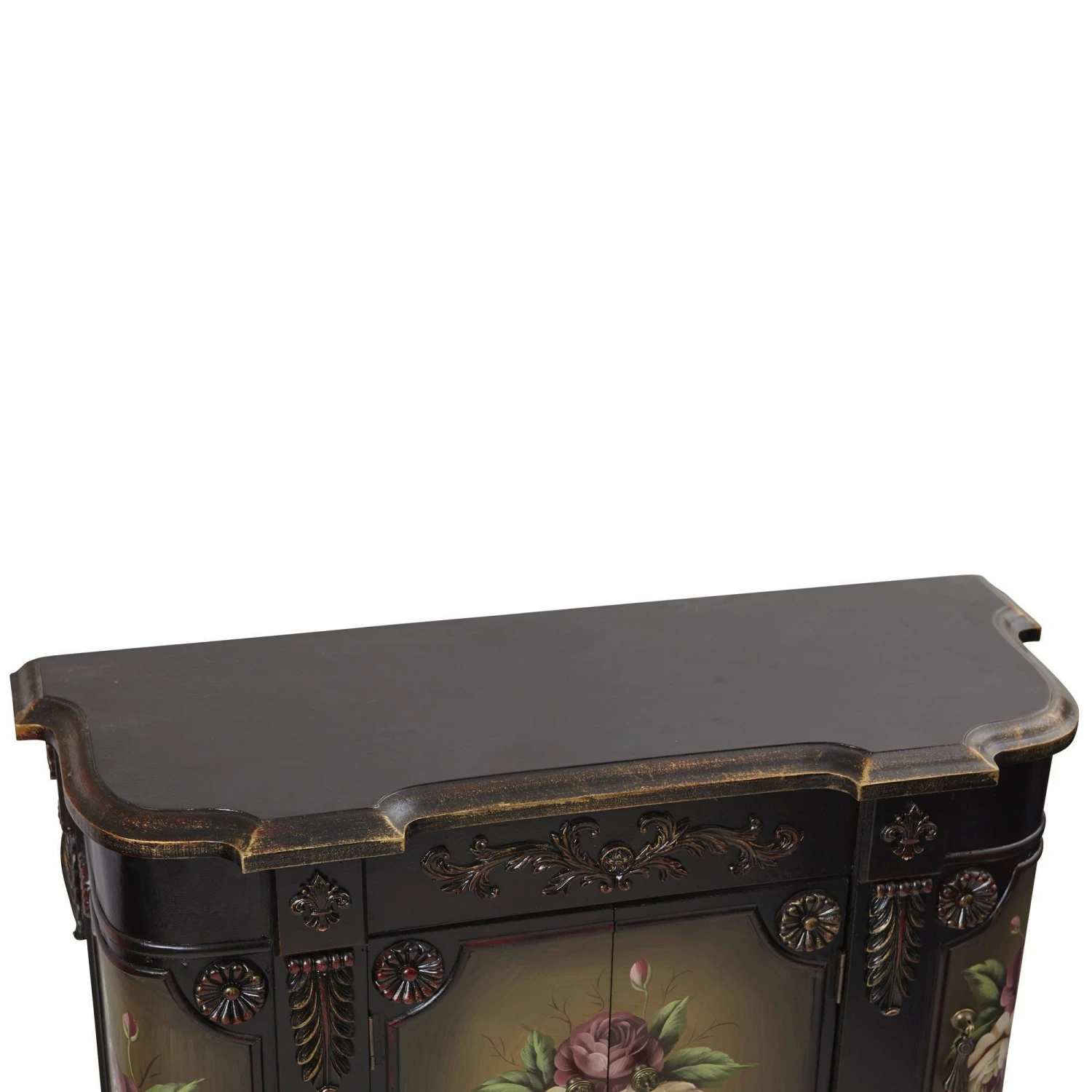 Finished in a rich brown, this vintage style floor cabinet measures 28” tall and 31.25” wide, making it the perfect storage solution for extra household items. Mount a sunburst mirror and display books, clocks or lavender for a French-inspired vignette in the hallway. The four-door cabinet can also store china and silverware for a traditional, elegant style dining room. A glossy finish and subtle gold accents highlight the ornamental designs and intricate crown molding on the cabinet’s doors. Each door features a dusty pink peony motif.