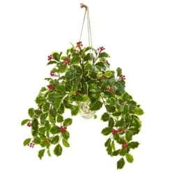 30” Variegated Holly Berry Artificial Plant In Hanging Vase (Real Touch)