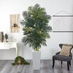 7.5′ Golden Cane Palm Artificial Tree In White Tower Planter