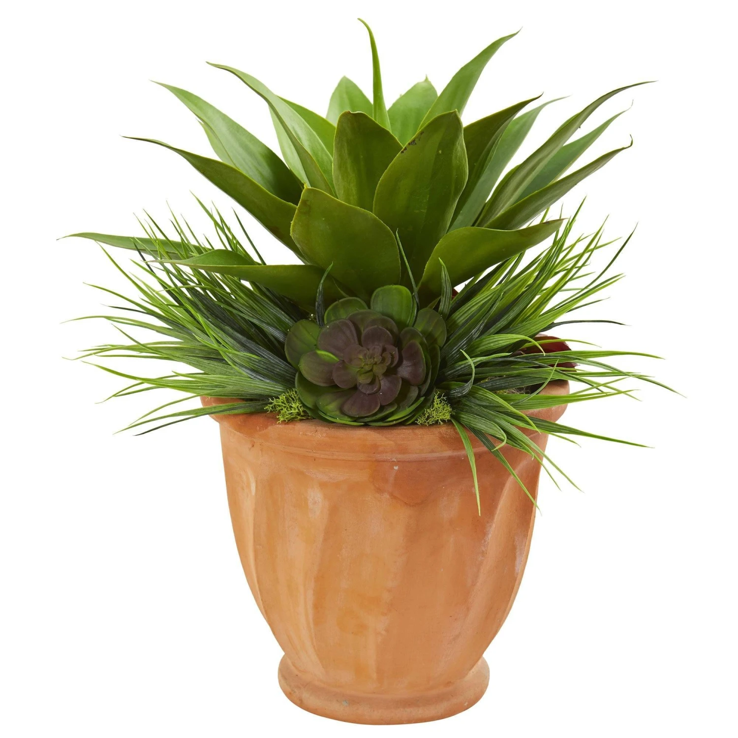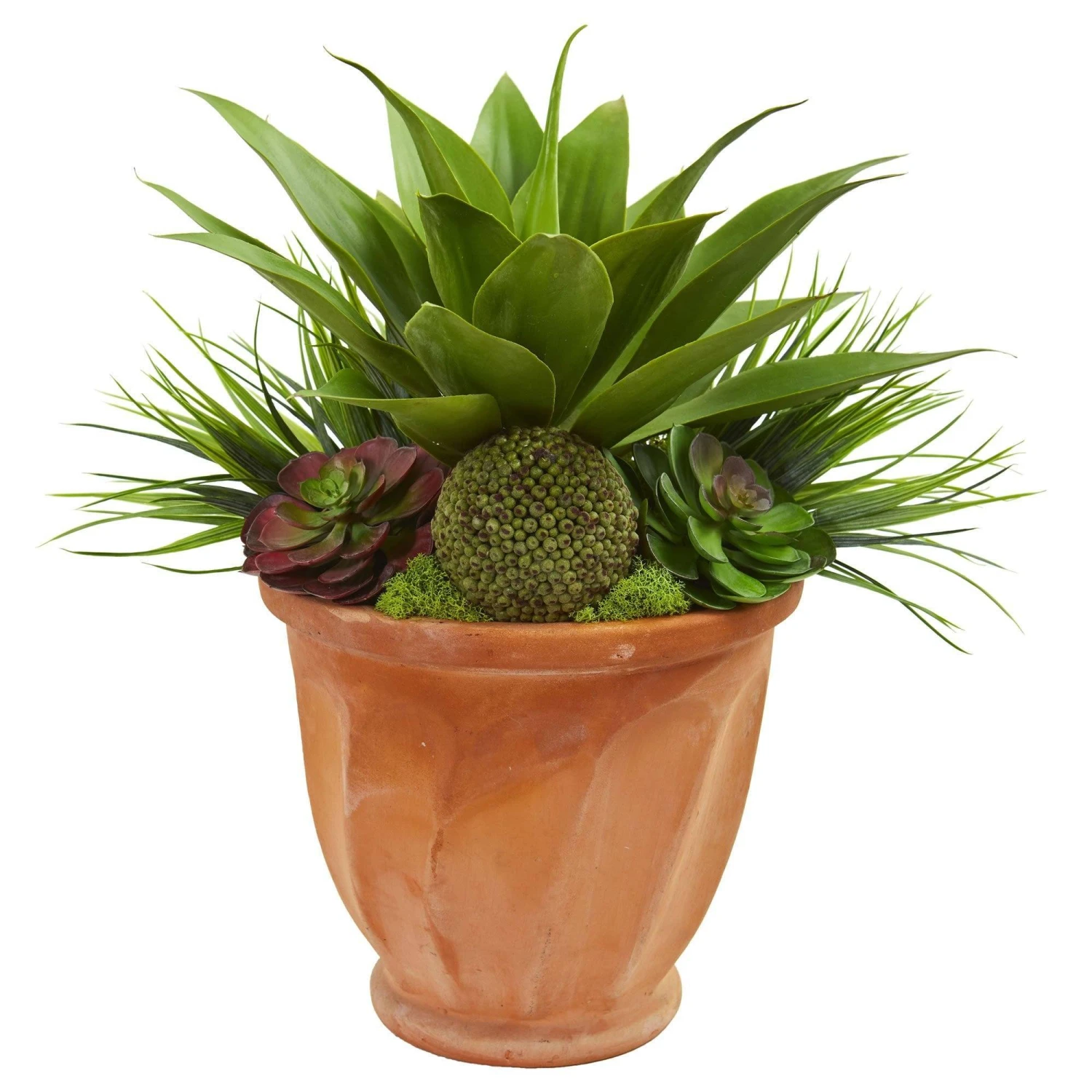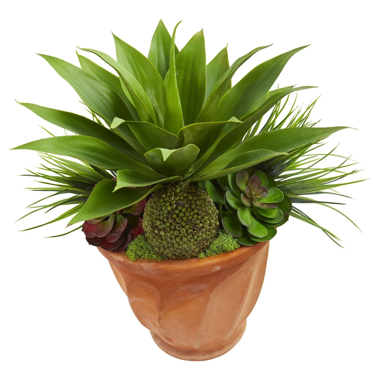 This beautiful succulent garden artificial plant features a fountain of sharp, long foliage towering over the different kinds of thick green succulents. With its breathtaking amount of rich green leaves—some drape down out of the included terra cotta planter– this ornament will brighten any décor scheme in your home or office. Bring out its intense coloring by placing it against a white wall or any white furniture. Or, to create a calm and relaxing environment, position it near your side table next to your floor lamp.