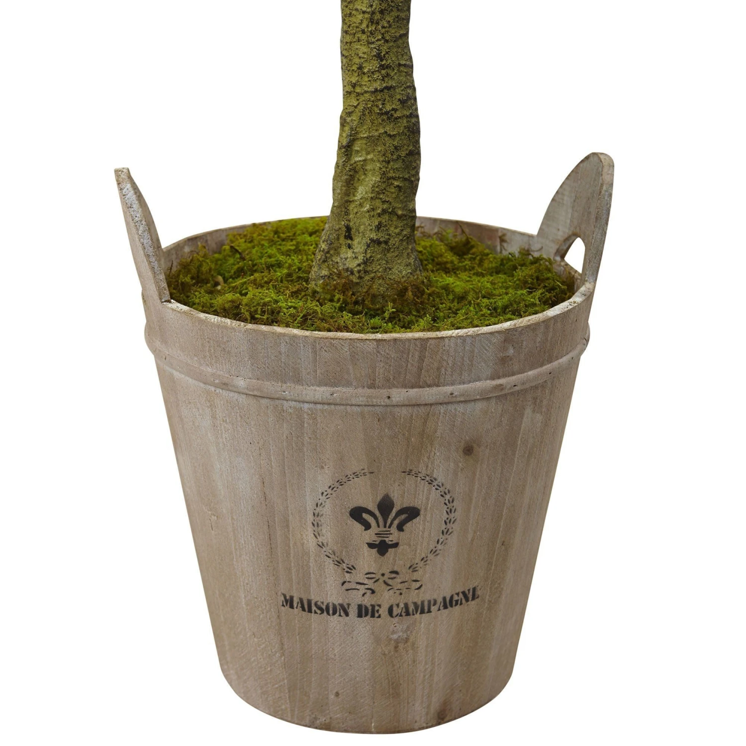 Shiny, green leaves point in every direction to create a full tree top. The textured branches are handcrafted to mimic a true tree. Green sheet moss lines the planter and is tufted up around the base of the tree. Comes in a wooden barrel planter with handles.